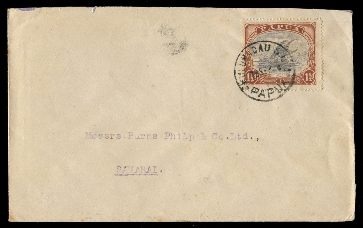 Sept.1928 usage of 1½d Lakatoi (SG.95d) with variety "POSTACE" at right on a commercial cover from KULUMADAU to SAMARAI.