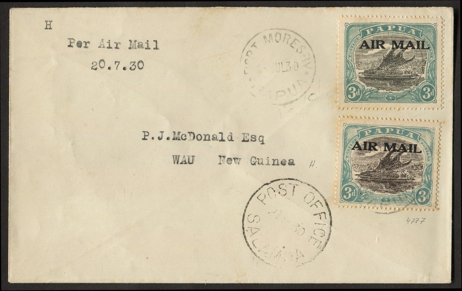 21 July 1930 (AAMC P20) Port Moresby - Salamaua - Wau flown cover, carried by Ray Parer for Morlae Airline Ltd, with PORT MORESBY despatch cds and SALAMAU arrival cds.