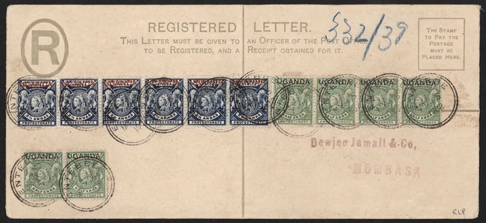 May 1902 usage of 2a UGANDA Overprint Registration Envelope (H&G.1b), uprated with 6 x ½a green UGANDA Opts (SG.92) + 6 x 2½a blue UGANDA Opts (SG.93) for use from ENTEBBE to MOMBASA, KENYA,