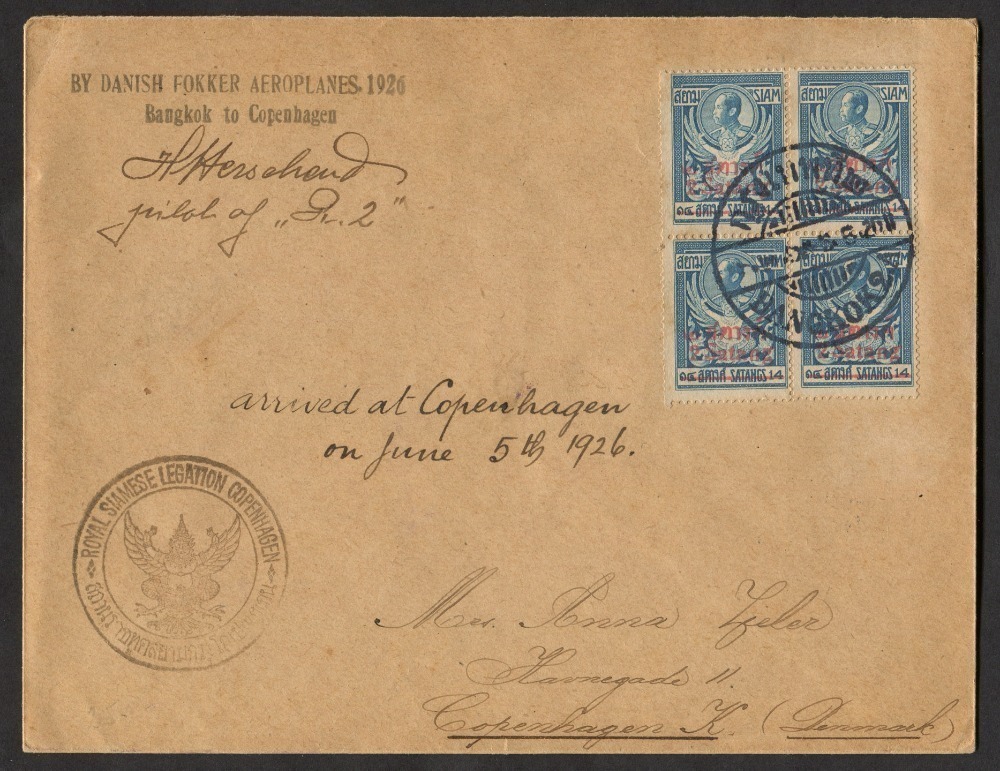 6th May 1926 Thailand - Denmark cover flown by Herschend & Petersen endorsed with "BY DANISH FOKKER AEROPLANES 1926 / Bangkok to Copenhagen" cachet at upper left and signed by pilot TP Herschend