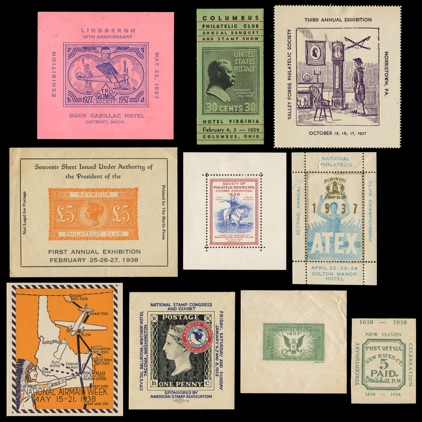 AMERICAN PHILATELIC EXHIBITIONS: 1937 - 1990 Nine volume collection of covers, poster stamps, vignettes and other ephemera, attractively presented on annotated album pages. A fascinating and hard to assemble
