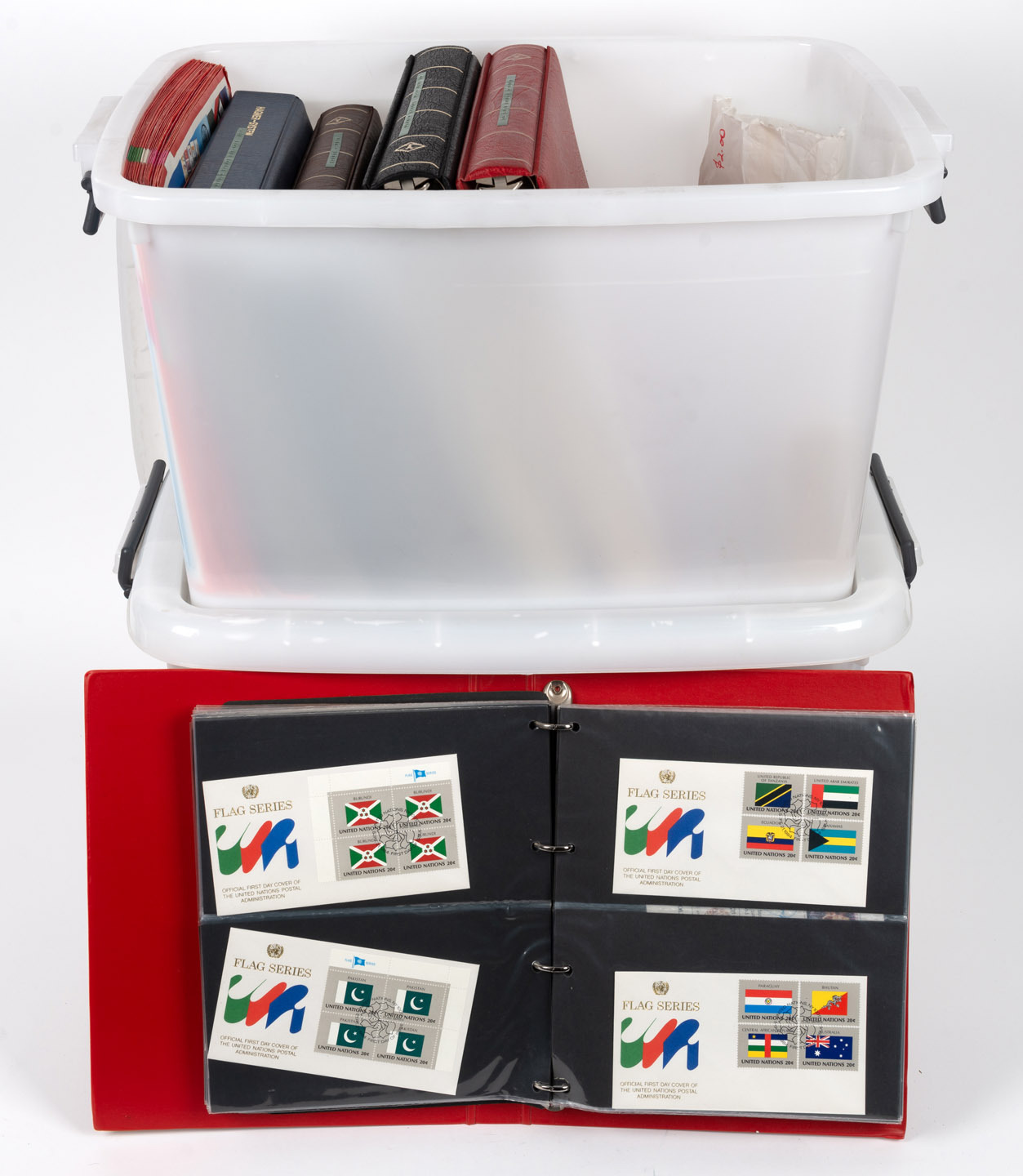 A substantial accumulation/collection of stamps, covers, cards, and associated material; mainly in Lighthouse albums and all housed in two large plastic tubs. Includes the 1955 10th Anniversary M/Sheet superb