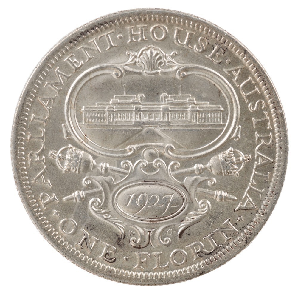 George V, 1927 Canberra. Three full steps visible in Parliament House, Uncirculated.