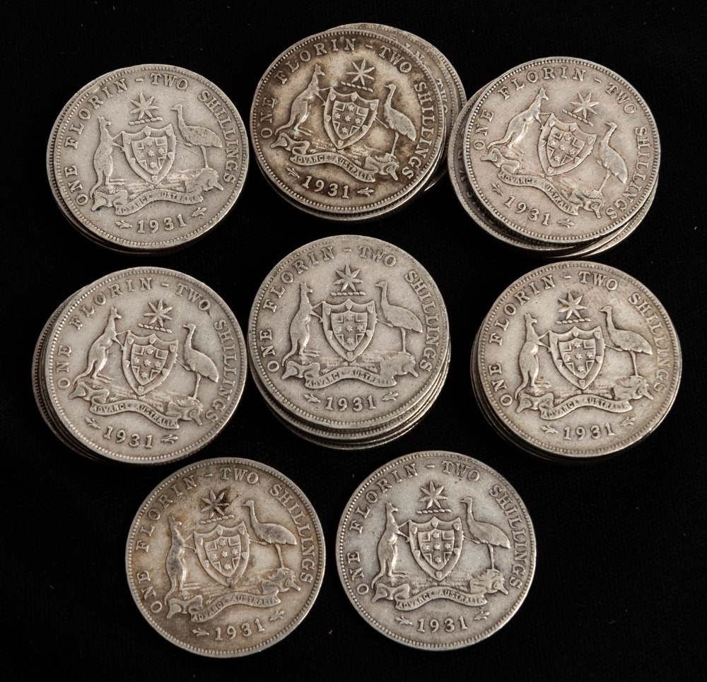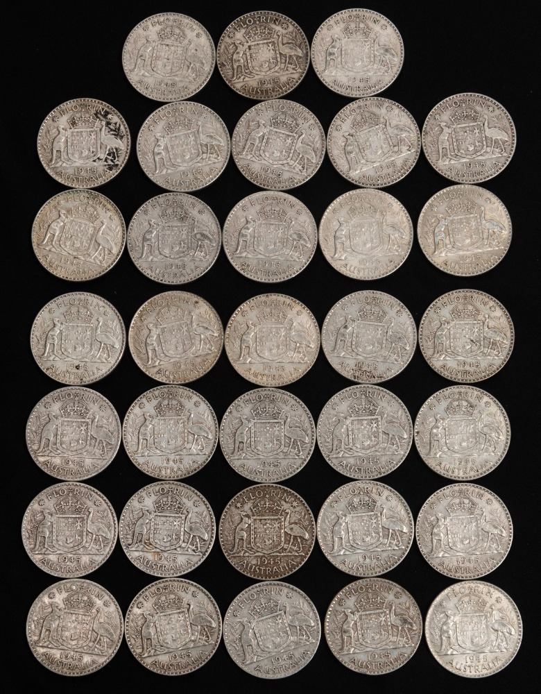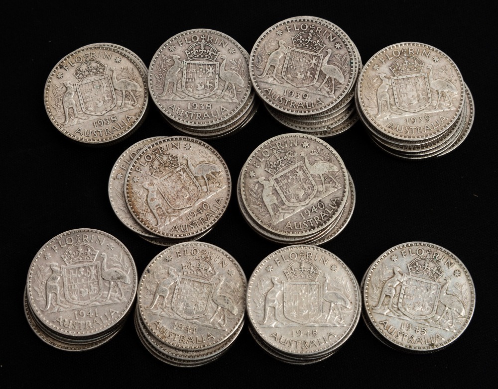 FLORINS: 1938 (10), 1939 (10), 1940 (10), 1941 (10), 1942 (10), 1943 (10), 1944 (5) and 1945 (10), mixed condition, mainly F-VF. (75).