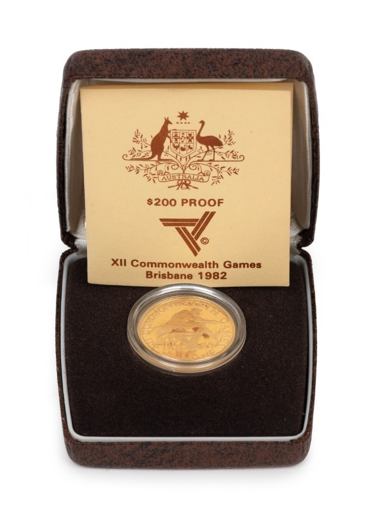 TWO HUNDRED DOLLARS, 1982 $200 gold Commonwealth Games, Proof; in original box of issue.