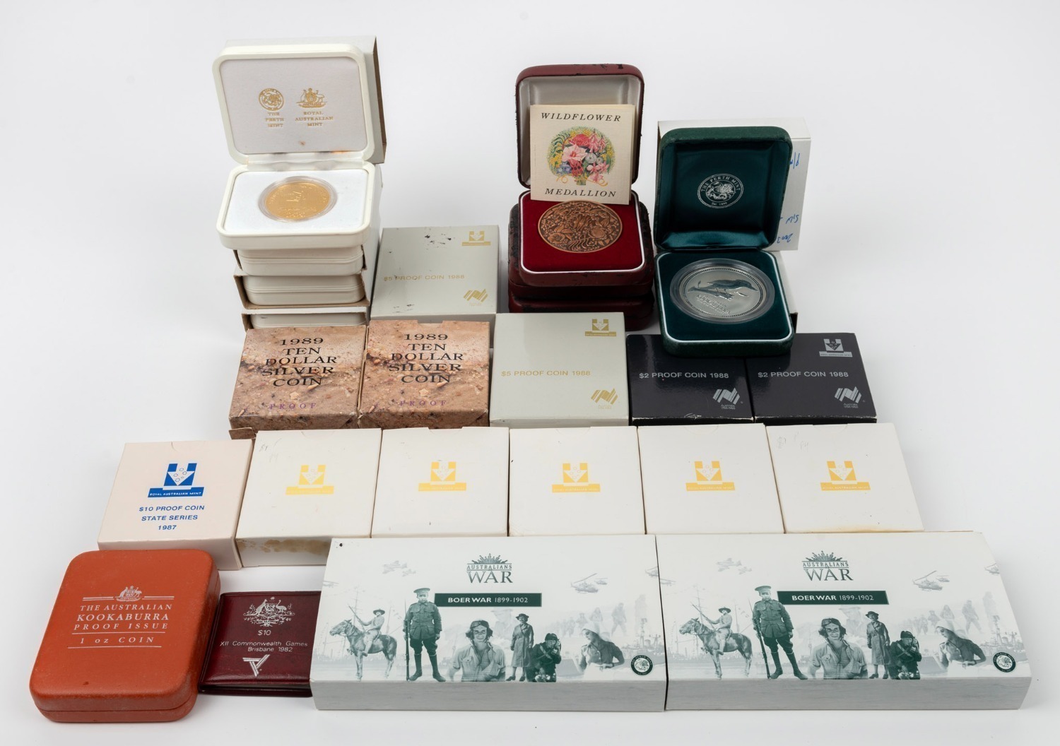 Wildflower medallions, 2000 Olympics silver coin series medallions (2) and gold coin series medallions (2), 2003 silver Kookaburra 2oz, 1oz (2 different) Proofs, and 2003 Boer War 1oz and 2oz Tribute boxed sets (x2). (Total: 25 items).