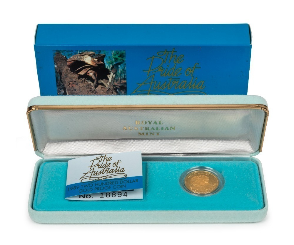 TWO HUNDRED DOLLARS, 1989 $200 gold Frilled Neck Lizard, Proof; in original box of issue.