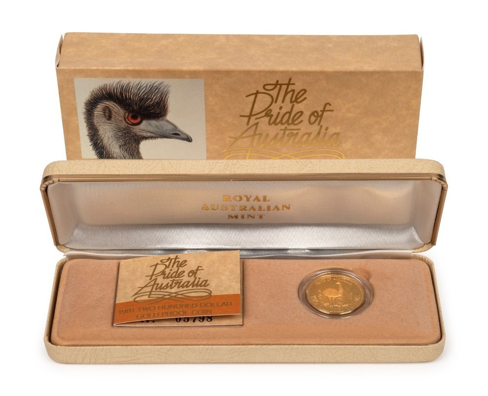 TWO HUNDRED DOLLARS, 1991 $200 gold Emu, Proof; in original box of issue.