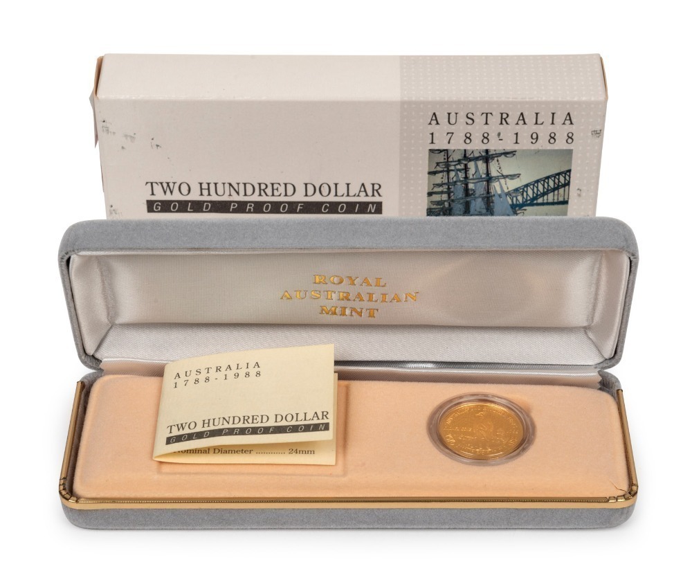 TWO HUNDRED DOLLARS, 1988 $200 gold First Fleet, Proof; in original box of issue.