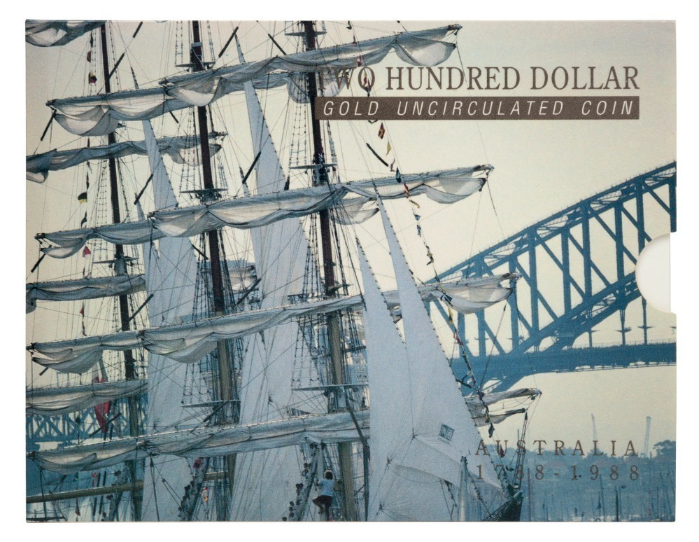 TWO HUNDRED DOLLARS, 1988 $200 gold First Fleet, uncirculated; in folder of issue.