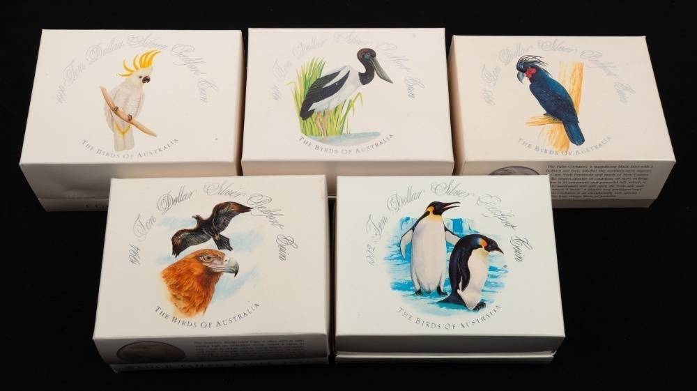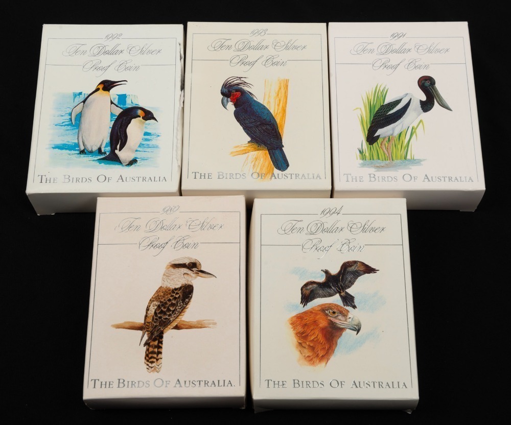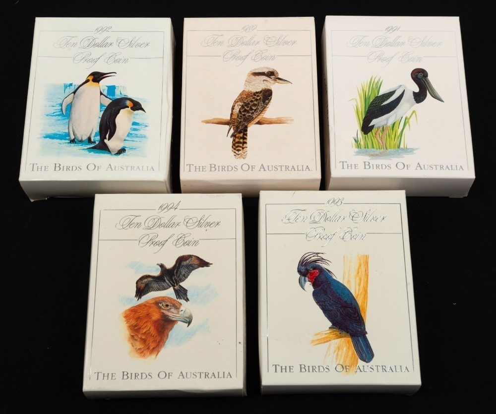 TEN DOLLAR SILVER PROOF COINS - THE BIRDS OF AUSTRALIA: 1989 $10 Kookaburra, 1991 $10 Jabiru, 1992 $10 Emperor Penguin, 1993 Palm Cockatoo, and 1994 $10 Wedge-Tailed Eagle; all in original packaging with
