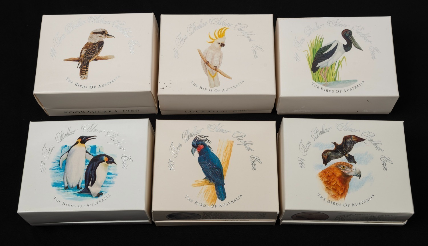 TEN DOLLAR SILVER PIEDFORT PROOF COINS - THE BIRDS OF AUSTRALIA: 1989 $10 Kookaburra, 1990 $10 Cockatoo, 1991 $10 Jabiru, 1992 $10 Emperor Penguin, 1993 Palm Cockatoo, and 1994 $10 Wedge-Tailed Eagle; all