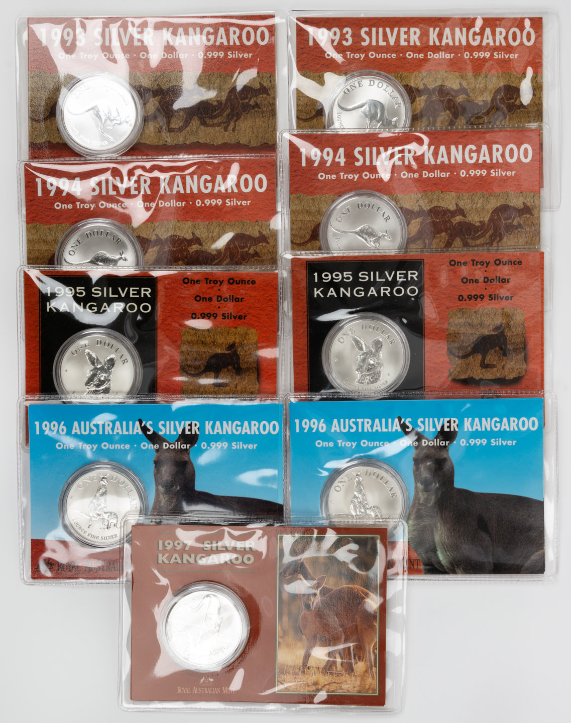 RAM KANGAROO SILVER DOLLARS in cards as issued: 1993 (2), 1994 (2), 1995 (2), 1996 (2) and 1997 (1). (Total: 9).