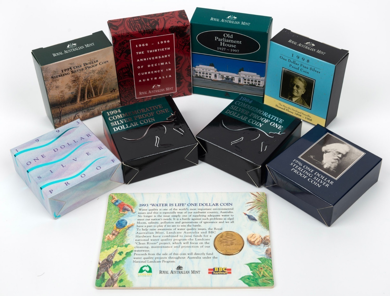 ONE DOLLAR SILVER PROOFS: 1993 (1), 1994 (2), 1996 Parkes (1), 1996 Decimal 30th Anniversary (1), 1997 Parliament House (1), plus a carded 1993 $1 Landcare Unc coin. (9 items).