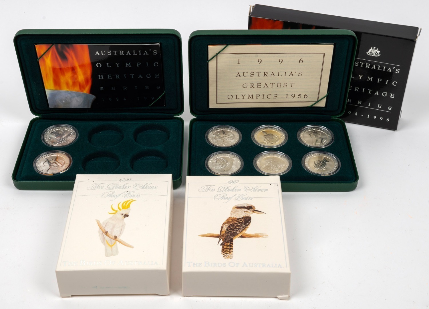TEN DOLLAR PROOFS: 1989 $10 Kookaburra, 1990 $10Cockatoo, and 1994-96 $10 Australia's Olympic Heritage (a set of 6 plus an incomplete set of 2). Total: 10 coins.