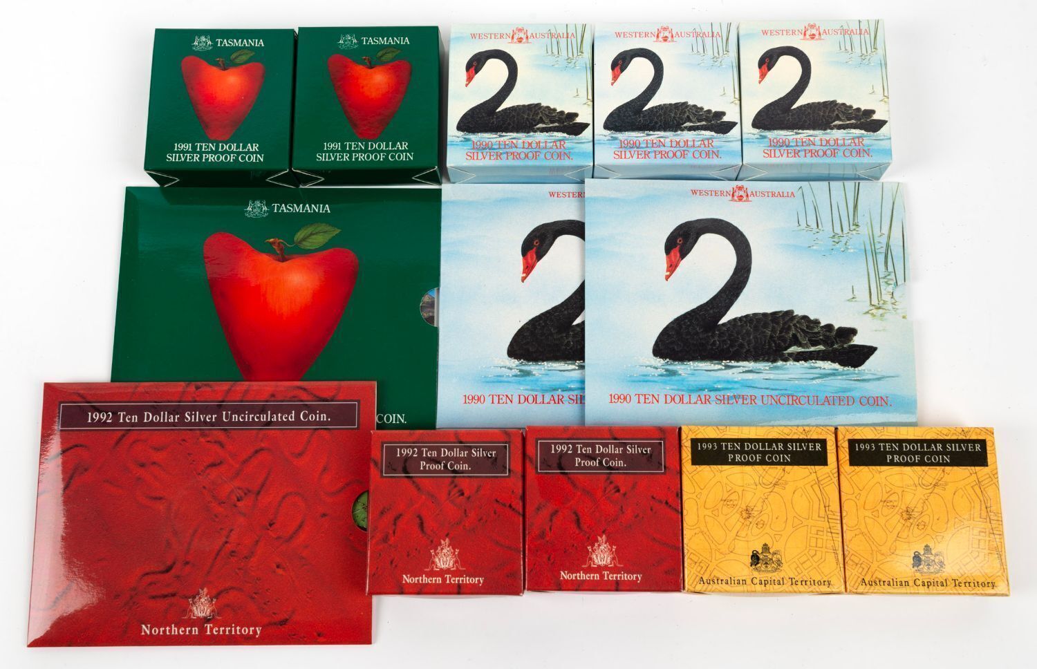 TEN DOLLAR COINS: $10 Western Australia (3 Proofs, 2 Unc.), 1991 Tasmania (2 Proofs, 1 Unc.), 1992 Northern Territory (2 Proofs, 1 Unc.) and 1993 A.C.T. (2 Proofs). All in original packaging.