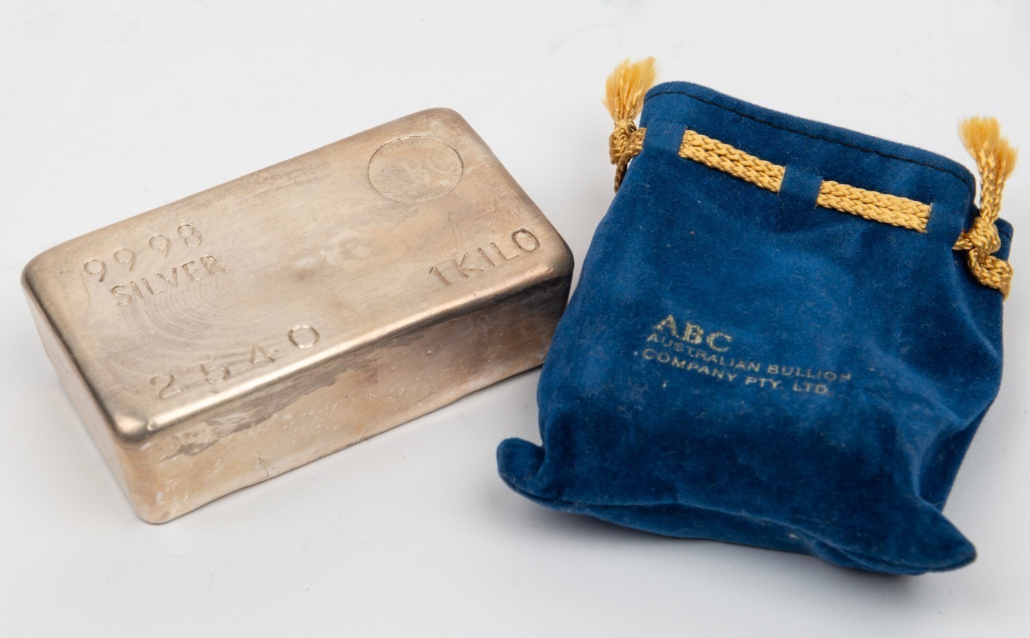 SILVER INGOT: A one kilogram 9998 silver ingot, minted by the Australian Bullion Company Pty. Ltd. Stamped No. 2540. (Image 1)