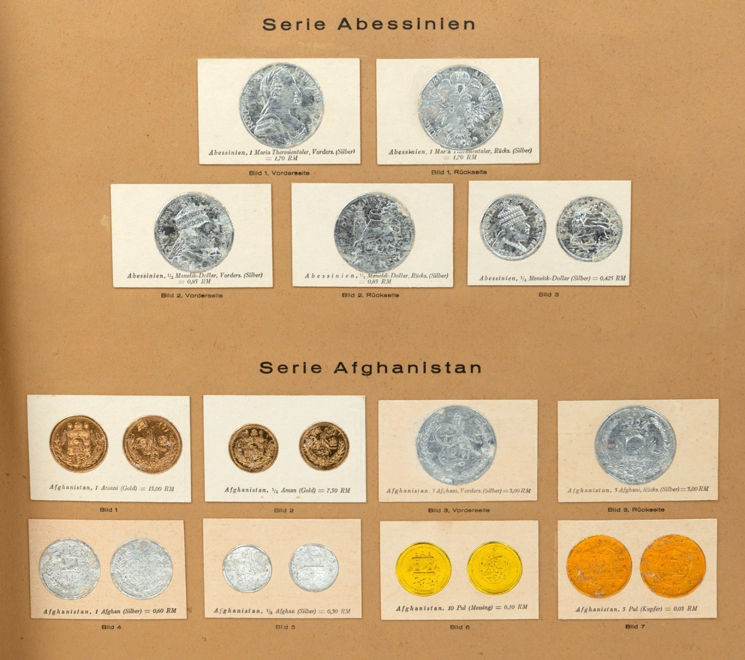 issued by the Greiling Cigarette Company (Dresden) depicting Coins of the World (obverses & reverses) in gold, silver & bronze relief. (Image 1)