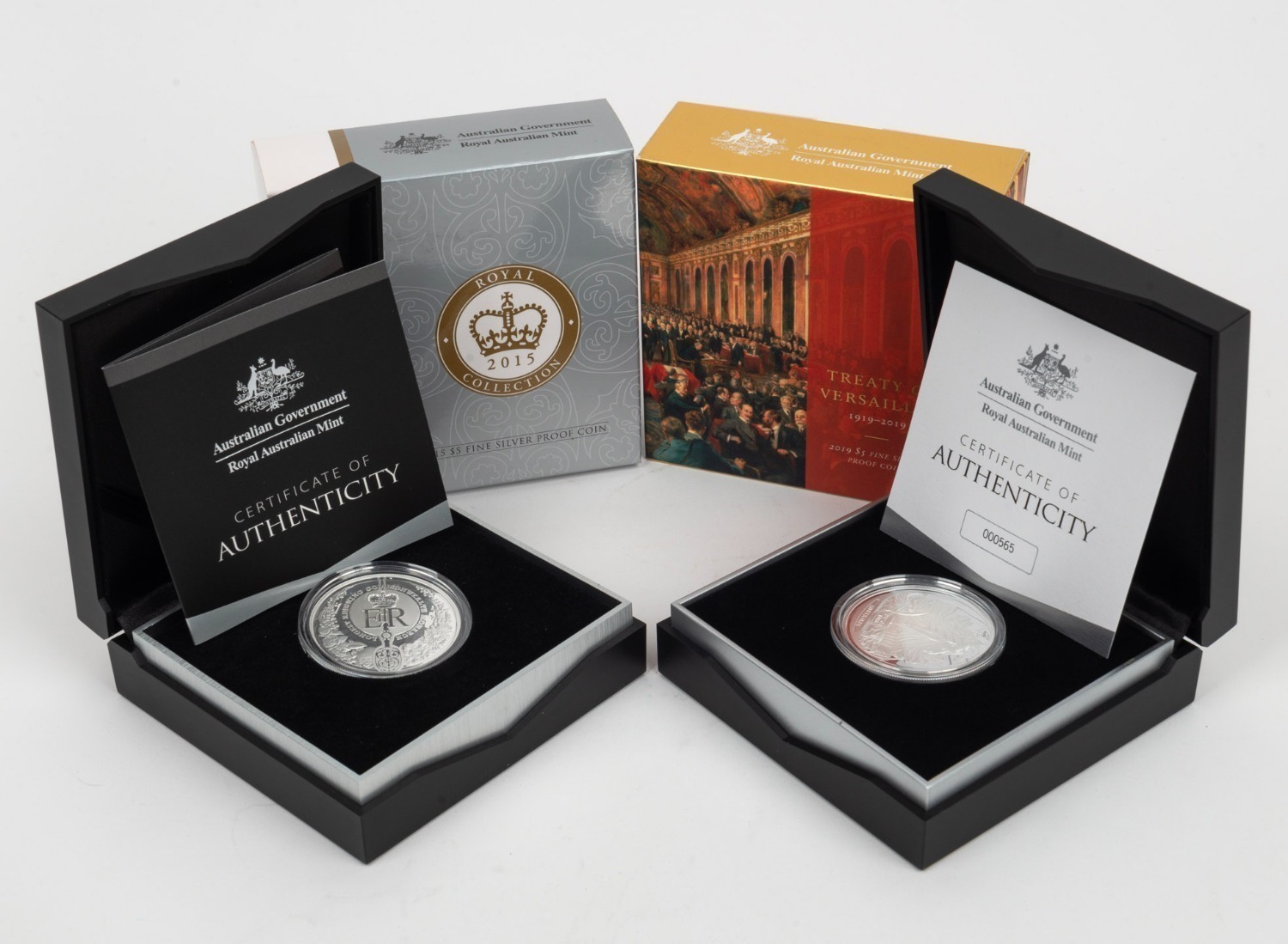 FIVE DOLLARS: Two RAM silver proofs, both in original cases with CoA and box, comprising 2015 'Longest-Reigning Commonwealth