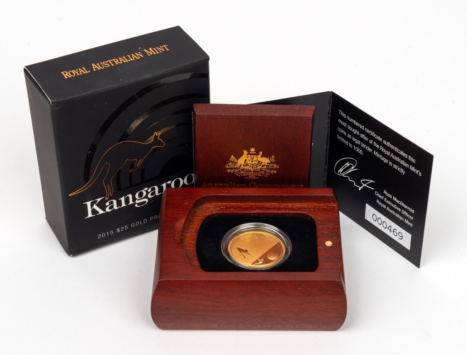 TWENTY-FIVE DOLLARS - 1/5oz GOLD PROOF: RAM 2015 'Kangaroo At Sunset' coin, limited edition 469/1000, in original case