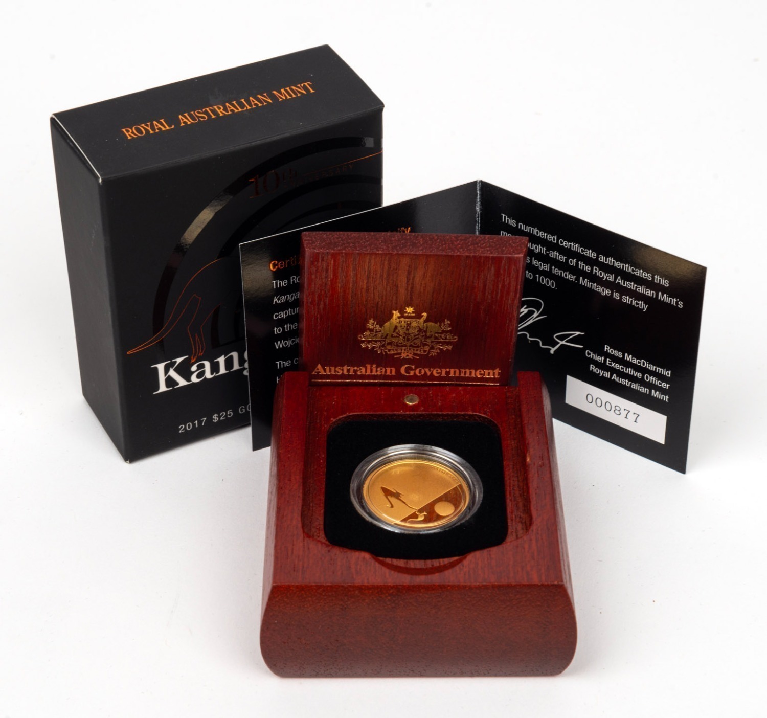 TWENTY-FIVE DOLLARS - 1/5oz GOLD PROOF: RAM 2017 'Kangaroo At Sunset' coin, limited edition 877/1000, in original case