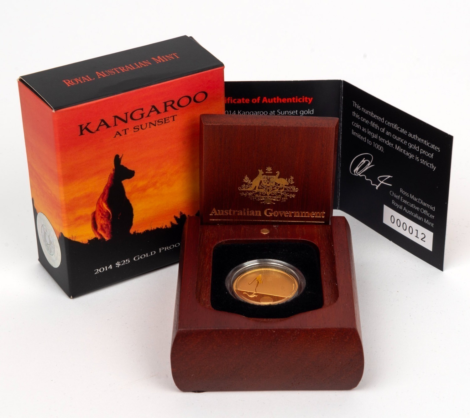 TWENTY-FIVE DOLLARS - 1/5oz GOLD PROOF: RAM 2014 'Kangaroo At Sunset' coin, limited edition 12/1000, in original case with