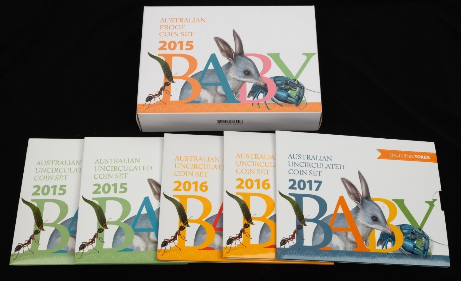 uncirculated baby coin sets, in original packaging, with bonus tokens present. (6 items) (Image 1)
