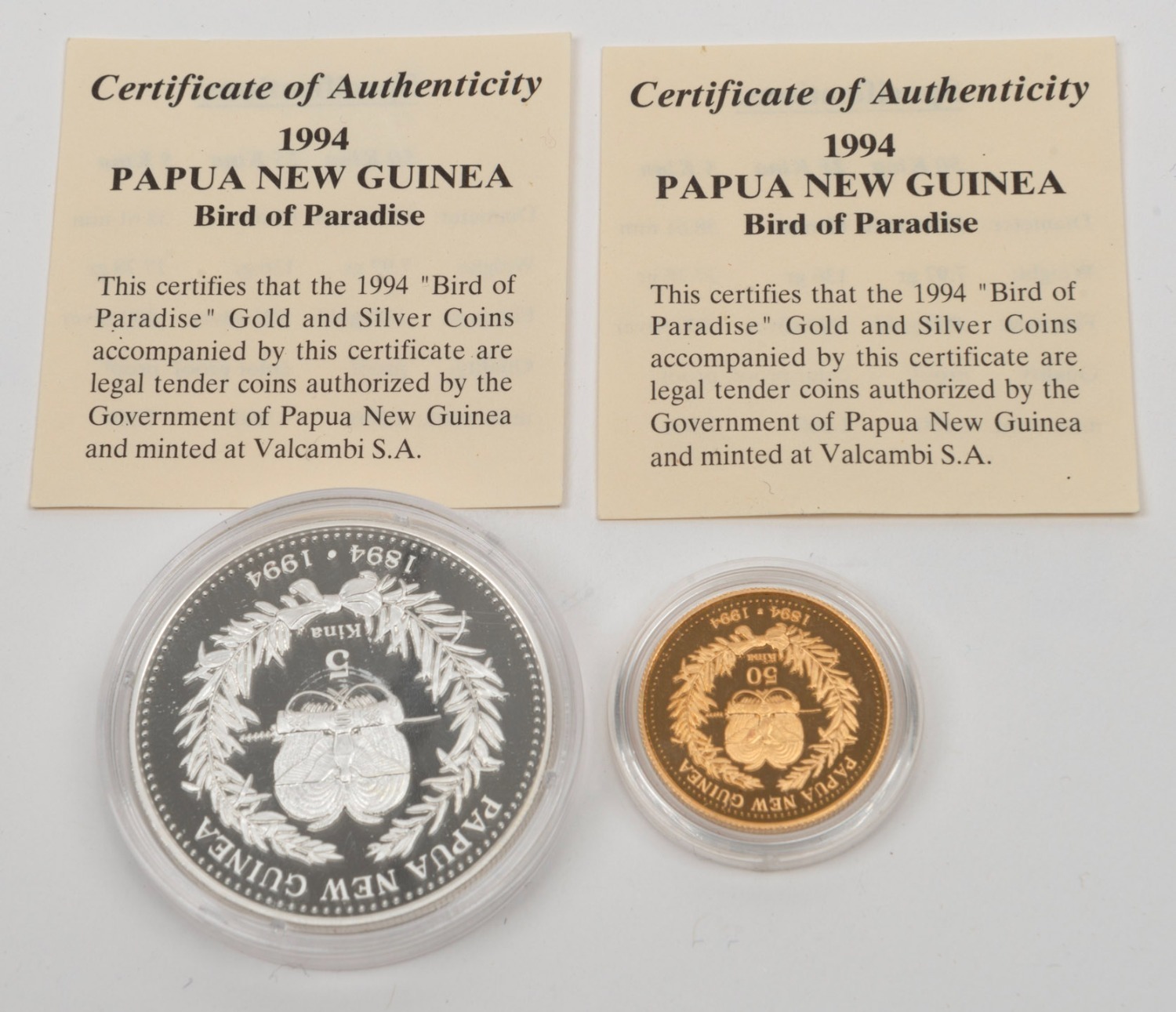 Papua New Guinea: 1994, 50 Kina gold Bird of Paradise proof; together with the 5 kina silver Bird of Paradise proof; both