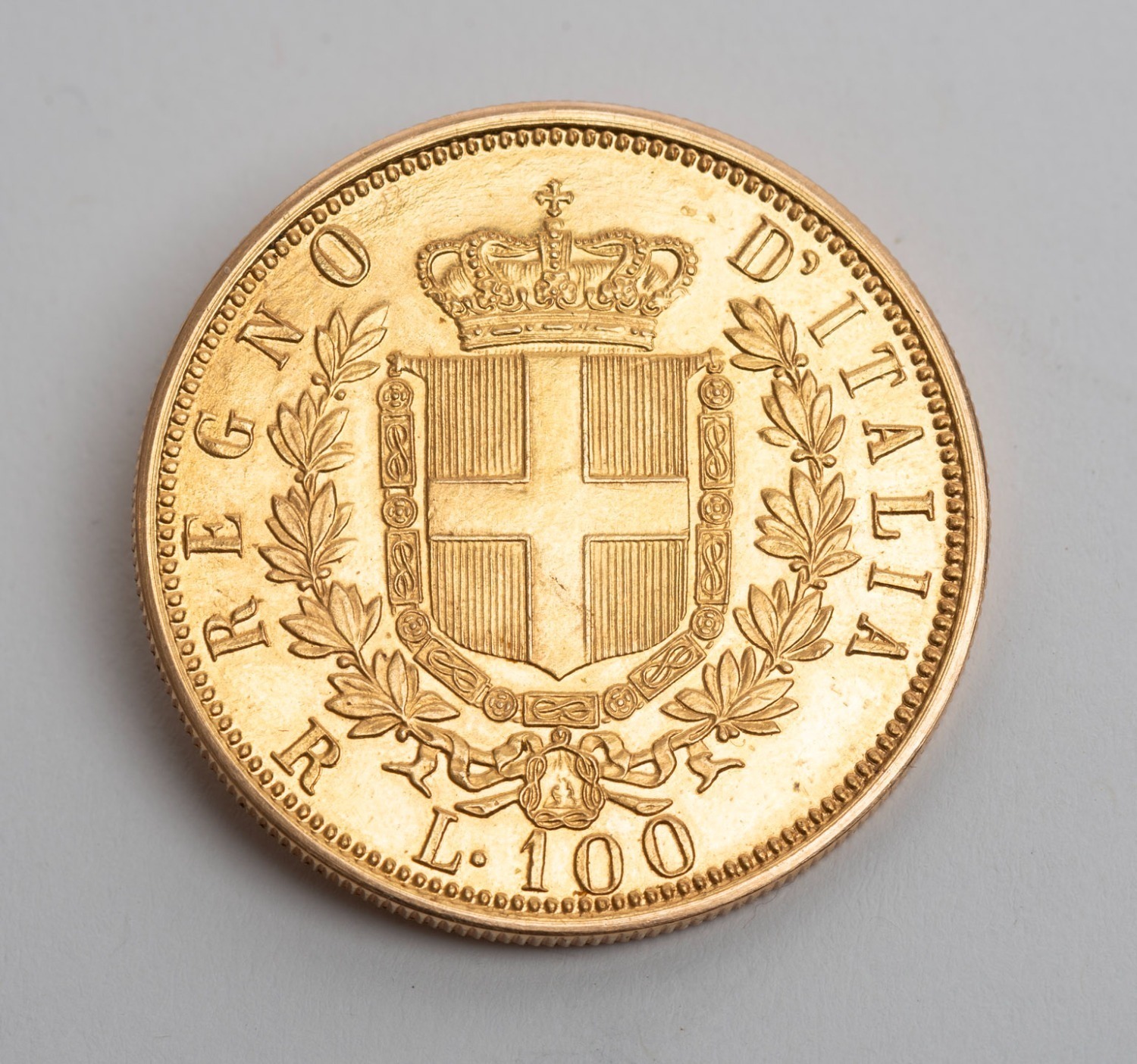 1872 Vittorio Emanuele II, 100 Lire gold (32.25g; 34mm), Rome Mint; aUnc. Extremely rare; only 661 examples were minted. (Image 1)
