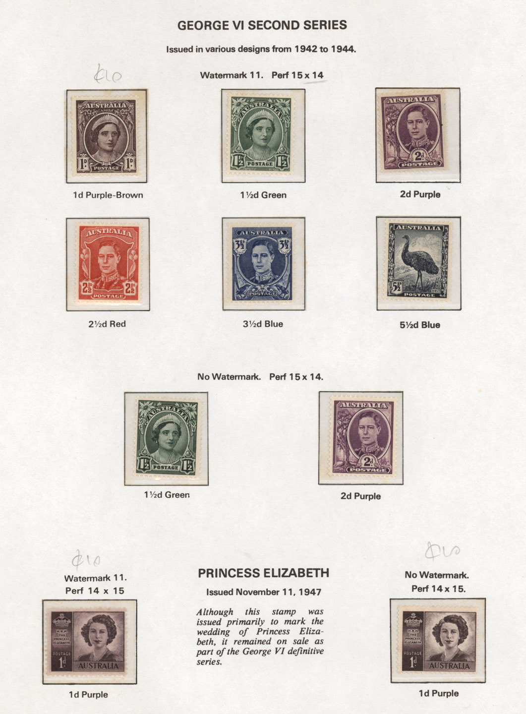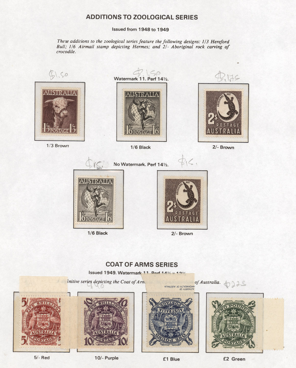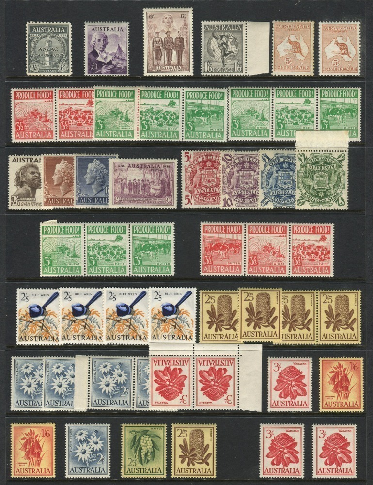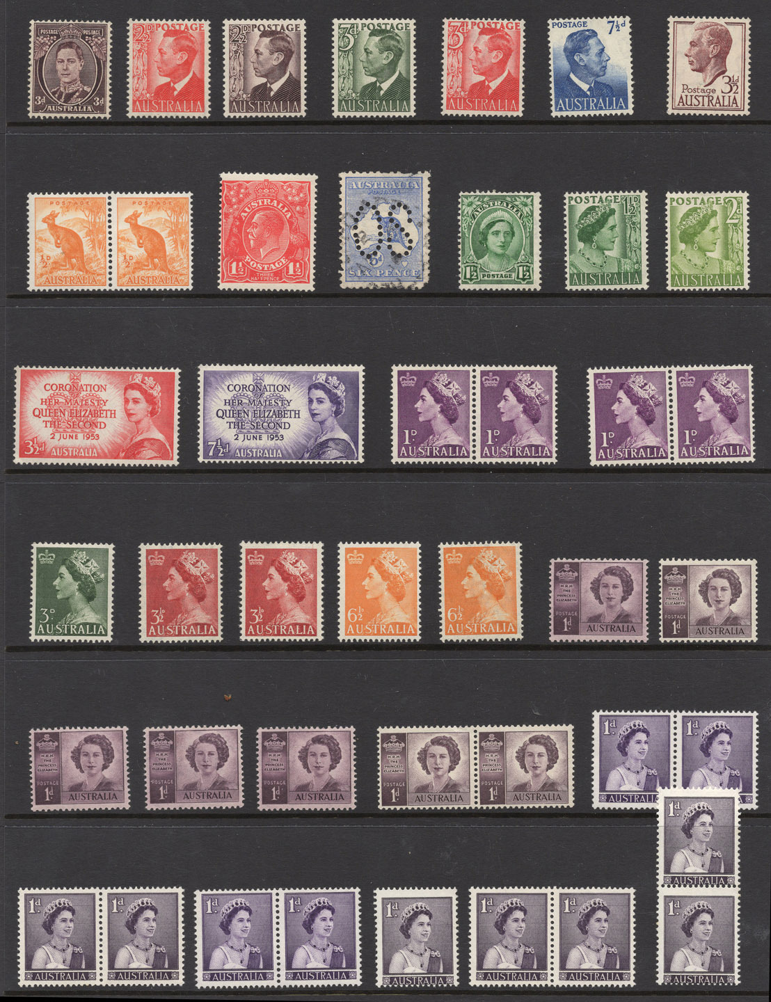 mainly U to 1/4, OS Opts M., perf OS M/U, 6d Kooka CTO, Kooka M/S Mint (thin), perf OS commems M/MUH, OS K.Smith CTO, Victoria, Macarthur, Anzac, Jubilee, etc. all M/MUH, Robes (Thick) M., Arms M/MUH, Robes, Arms and Navigator SPECIMEN sets M, 5/-