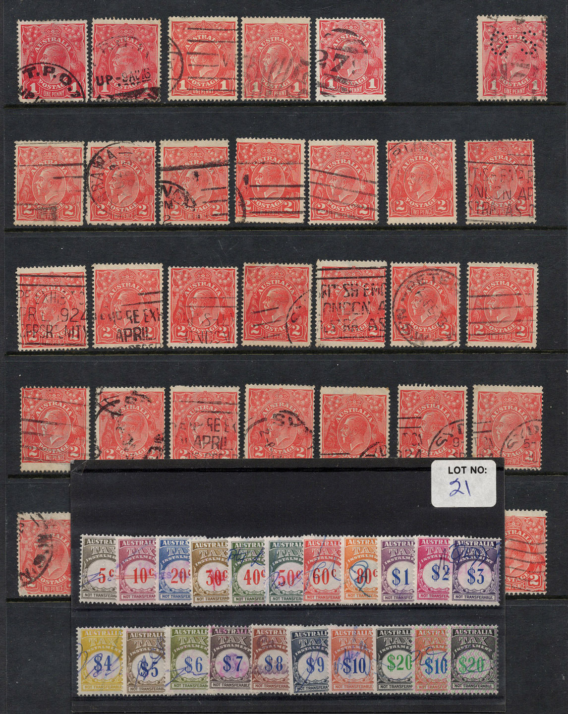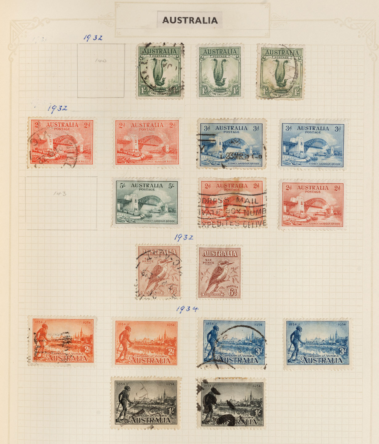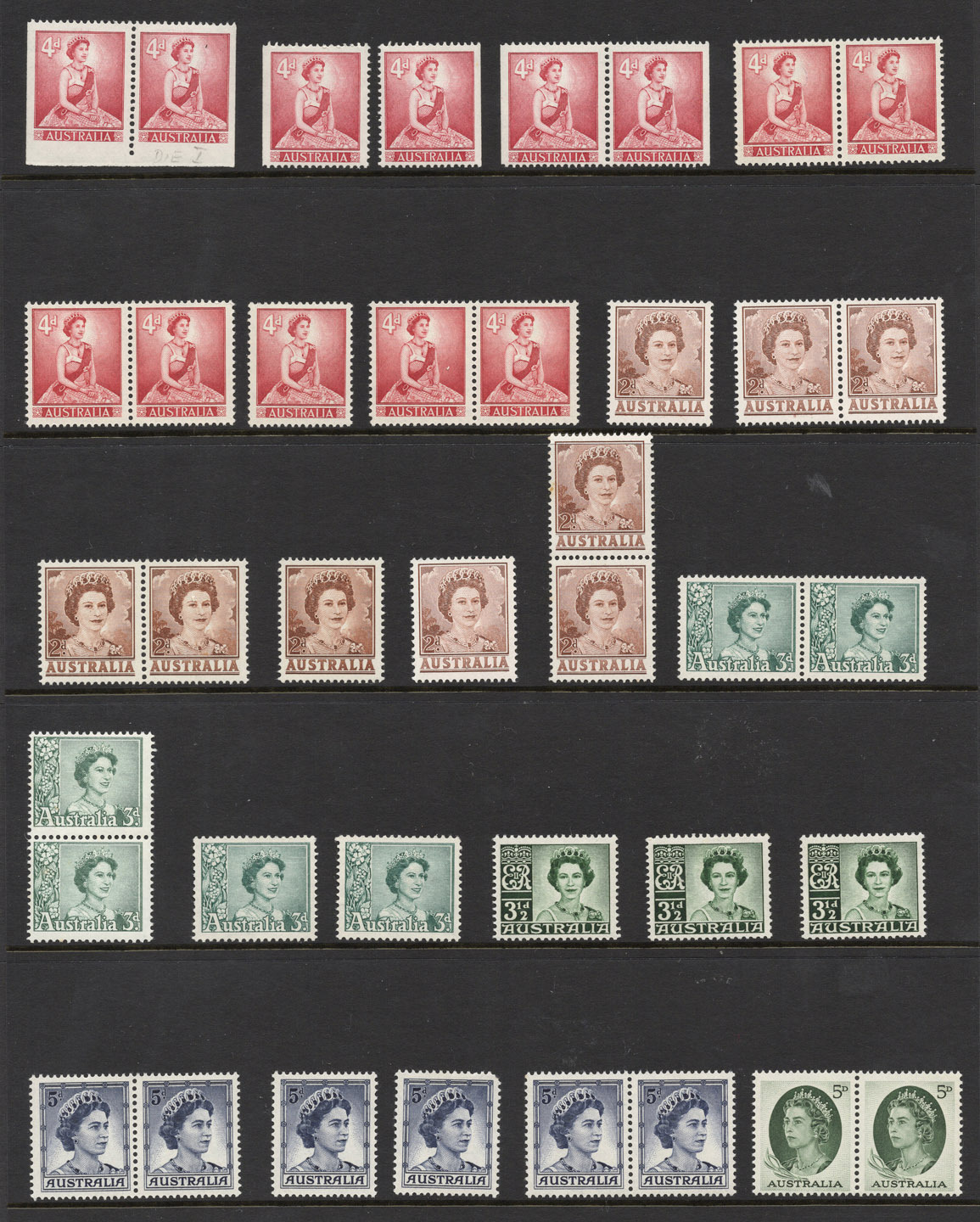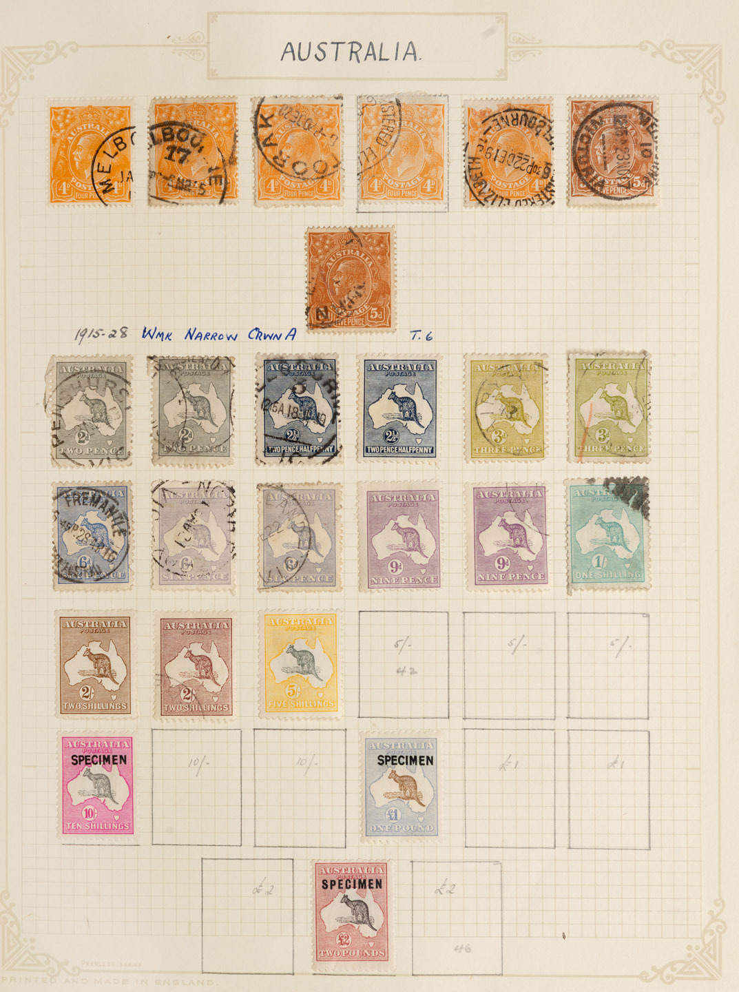 mainly U to 1/4, OS Opts M., perf OS M/U, 6d Kooka CTO, Kooka M/S Mint (thin), perf OS commems M/MUH, OS K.Smith CTO, Victoria, Macarthur, Anzac, Jubilee, etc. all M/MUH, Robes (Thick) M., Arms M/MUH, Robes, Arms and Navigator SPECIMEN sets M, 5/-