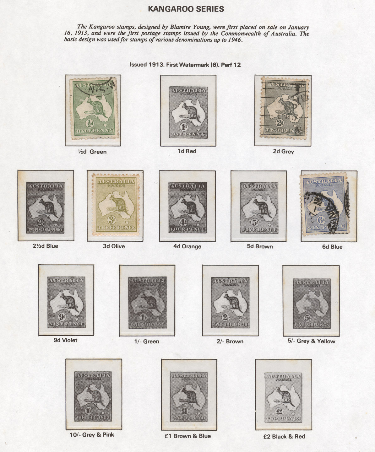 1913-65 collection in album; incl. 1st wmk 5/- Roo CTO, other Roos to 5/- incl. OS mainly U, £1 Grey Specimen, KGV heads
