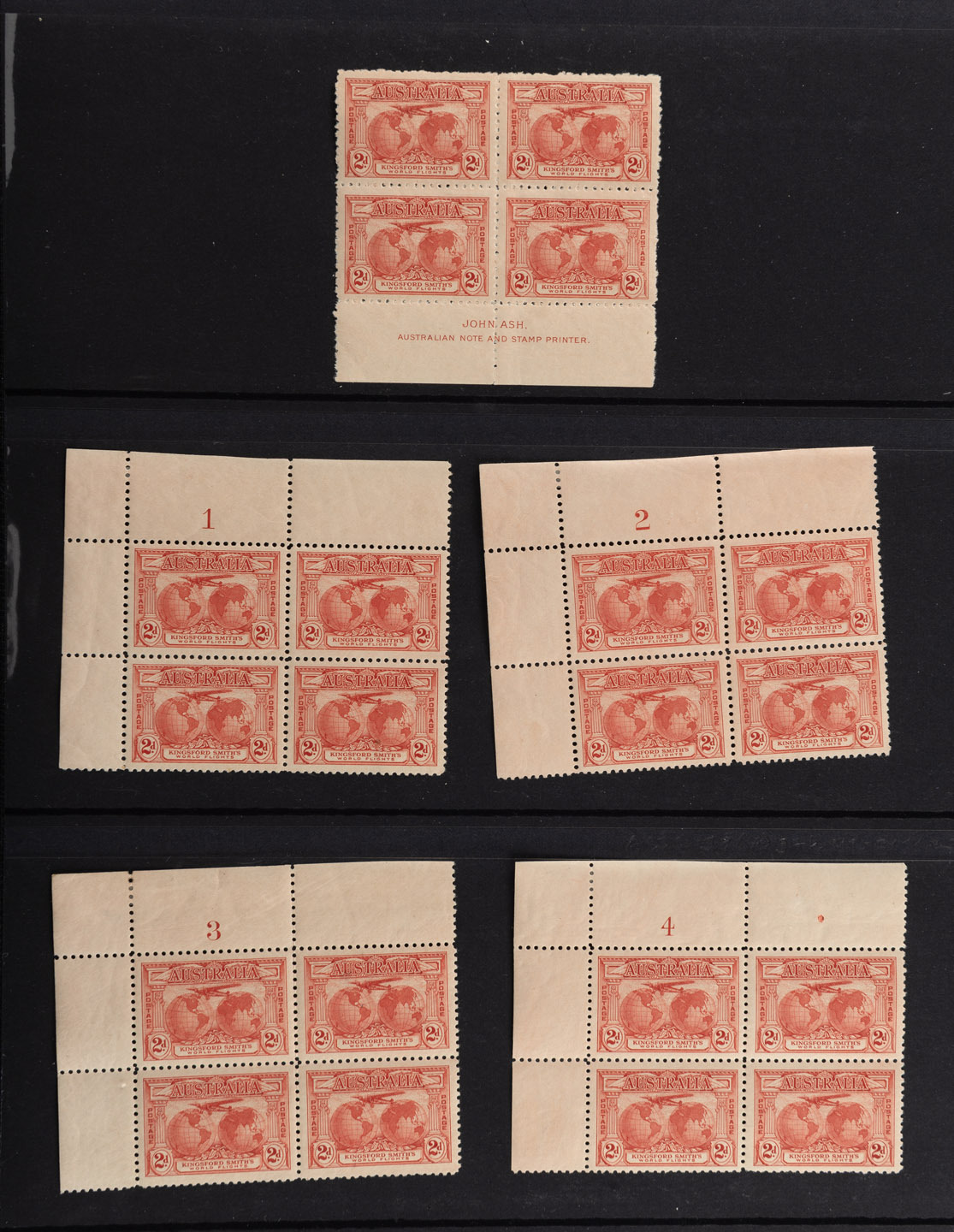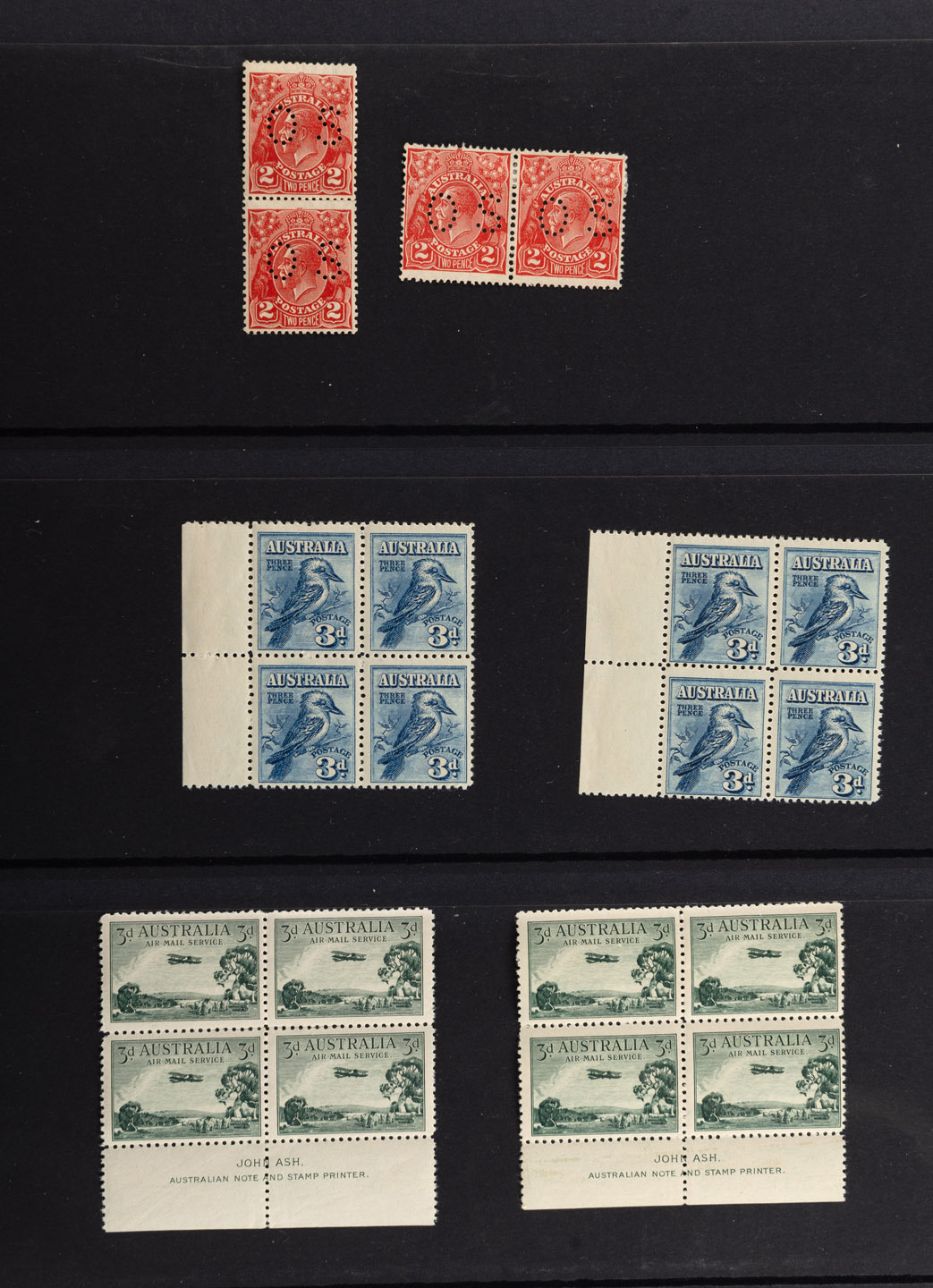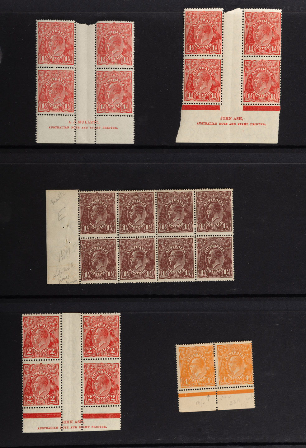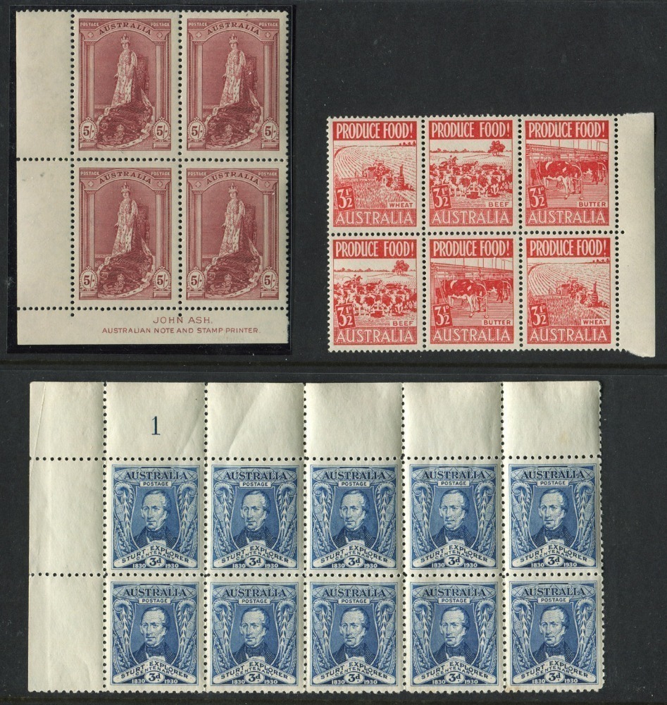 Imprints, 3d Airmail Imprint and Plate blks., Kingsford Smith Imprint and Plate blks., 6d Kooka & 1/- Large Lyrebird Imprint blks., 1934 Victoria Centenary Imprint blks., Macarthur set of 4 in Imprint blks., 1/6 claret Hermes (wmk) Ash &