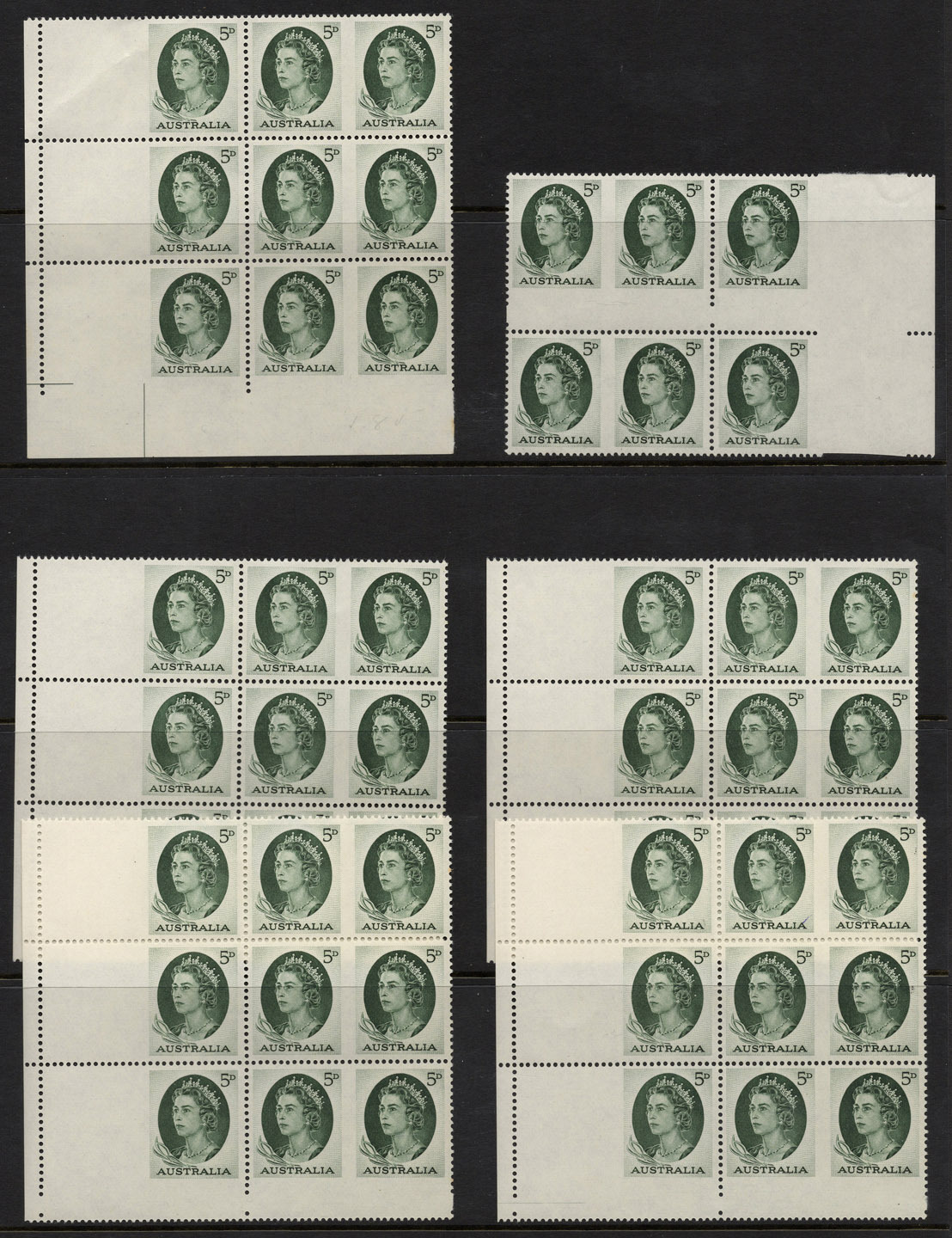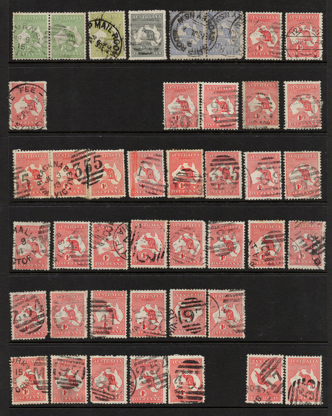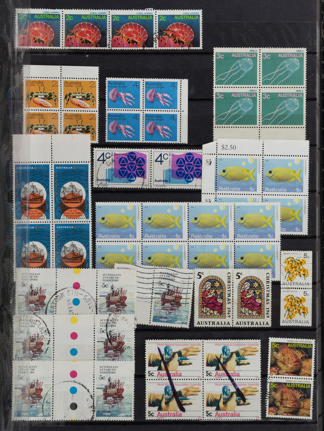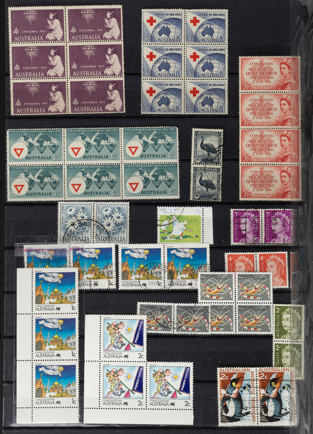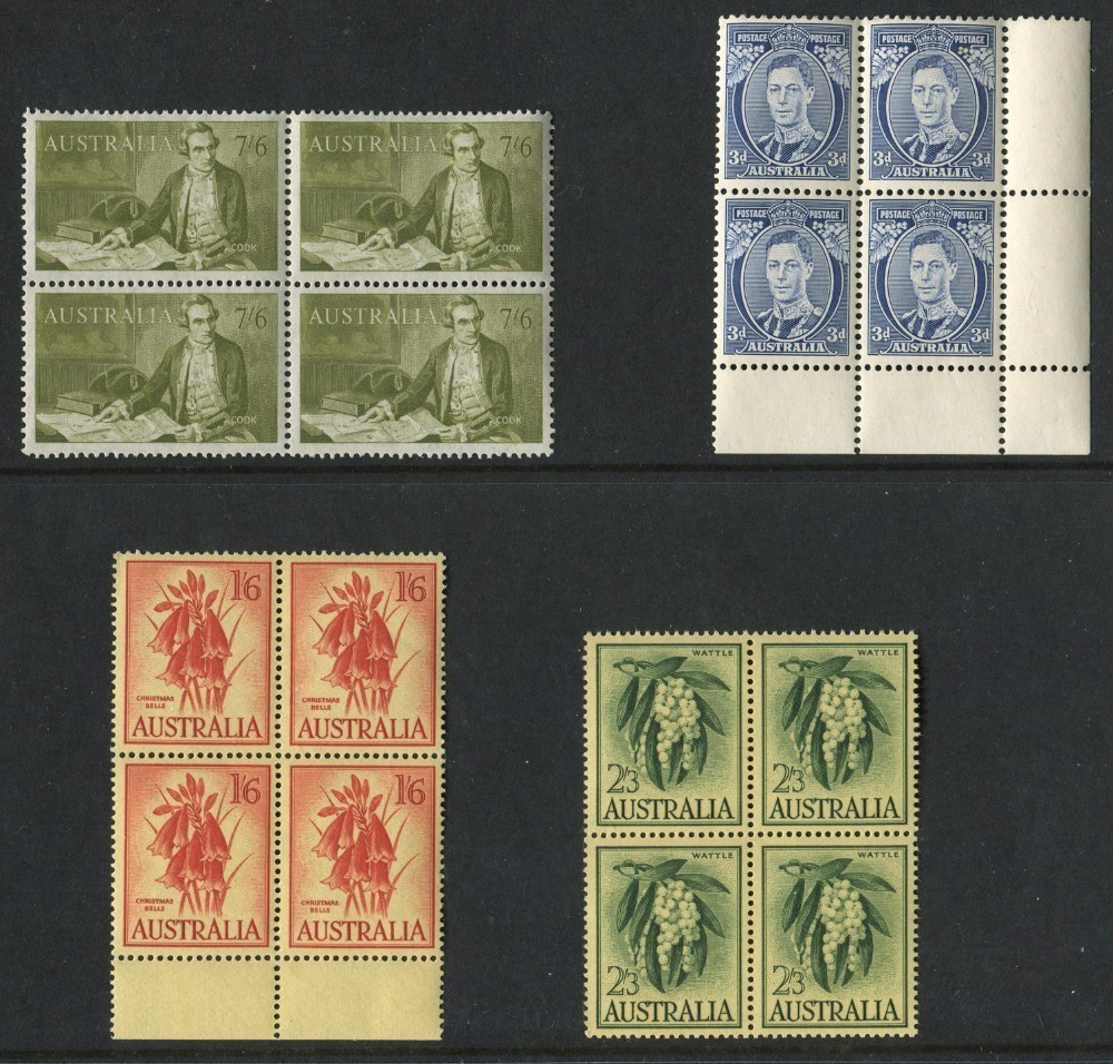 Kangaroos 3d Olive (blk.4 **), 4d Orange (blk.4 **), 5d Chestnut (2, regummed), KGV 1d Red Die 1+ Die 2 (submerged) marginal pair **, KGVI 3d Blue (Die 2) cnr.blk.4 **, Arms set to £2 **, 7/6 Cook blk.4 **, etc. (97 stamps). (Image 1)