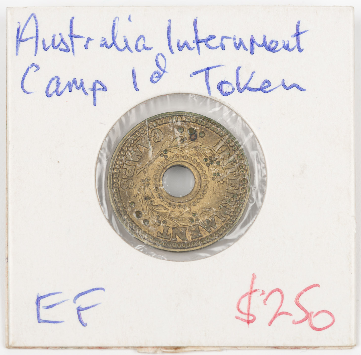 WW2 INTERNMENT CAMP CURRENCY TOKEN: One Penny, brass, EF. (Image 1)
