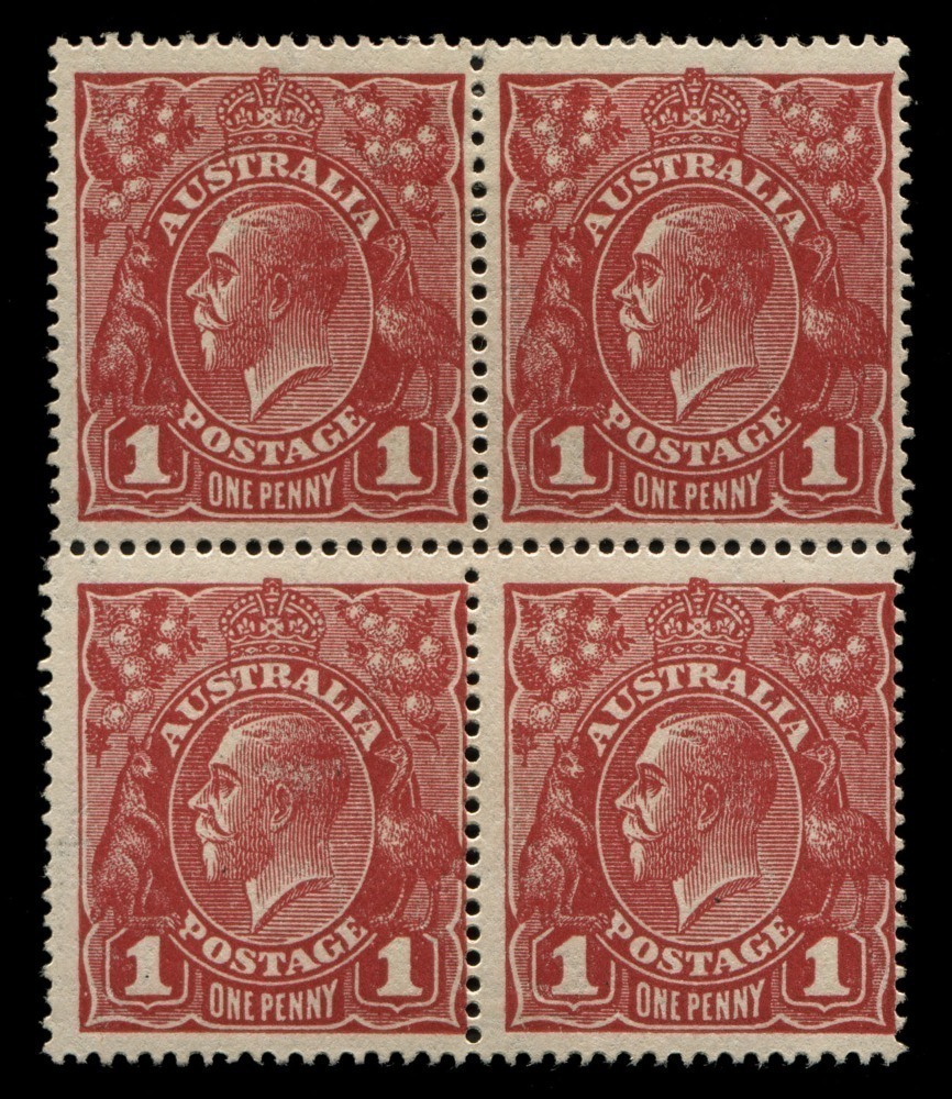 ONE PENNY RED HARRISON PRINTINGS: Plate 4, block of (4) [L53-54/59-60] with Ferns and 'RA' of 'AUSTRALIA'