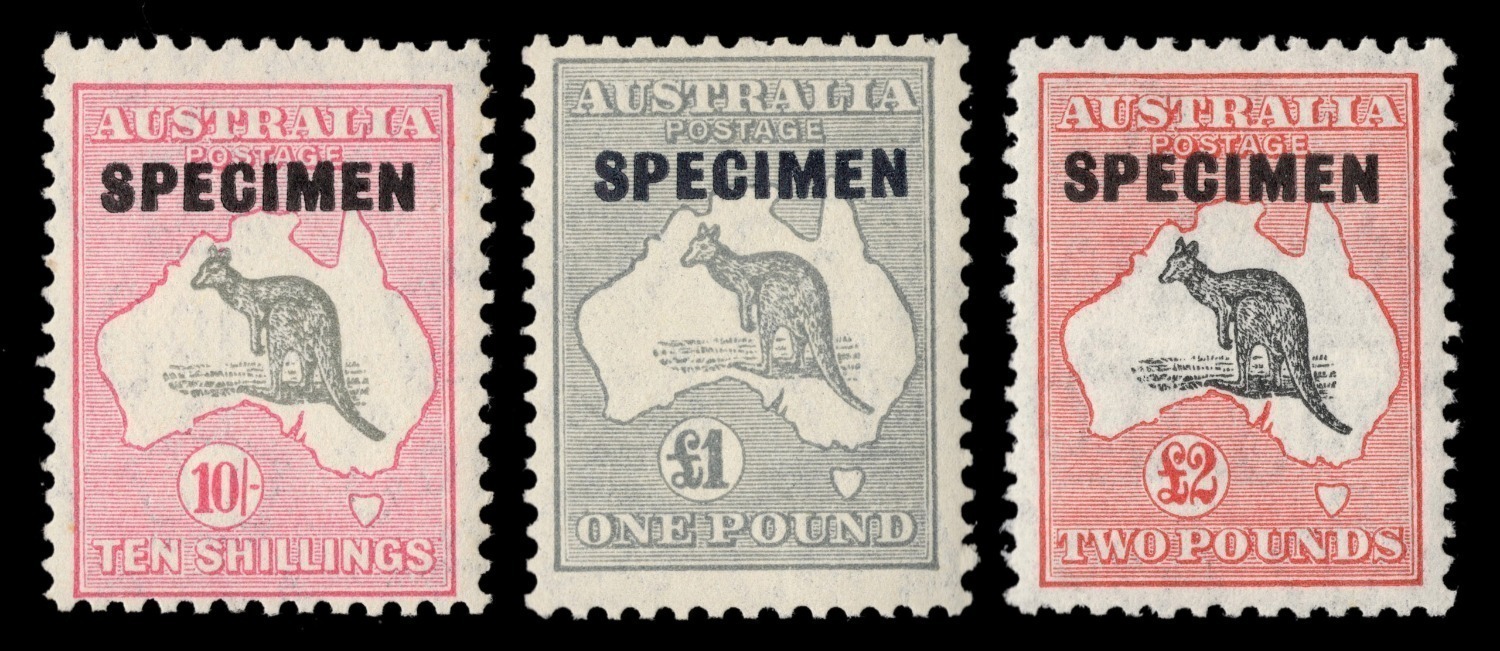 10/-, £1 and £2 SPECIMEN Overprints set, (3), fresh unmounted. (Image 1)