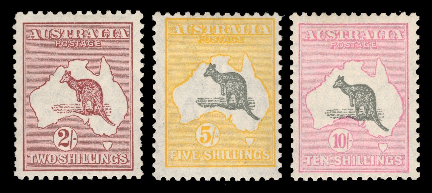 2/- Maroon, 5/- Grey & Yellow, and 10/- Grey & Pink, all fine & fresh MLH. (3). (Image 1)