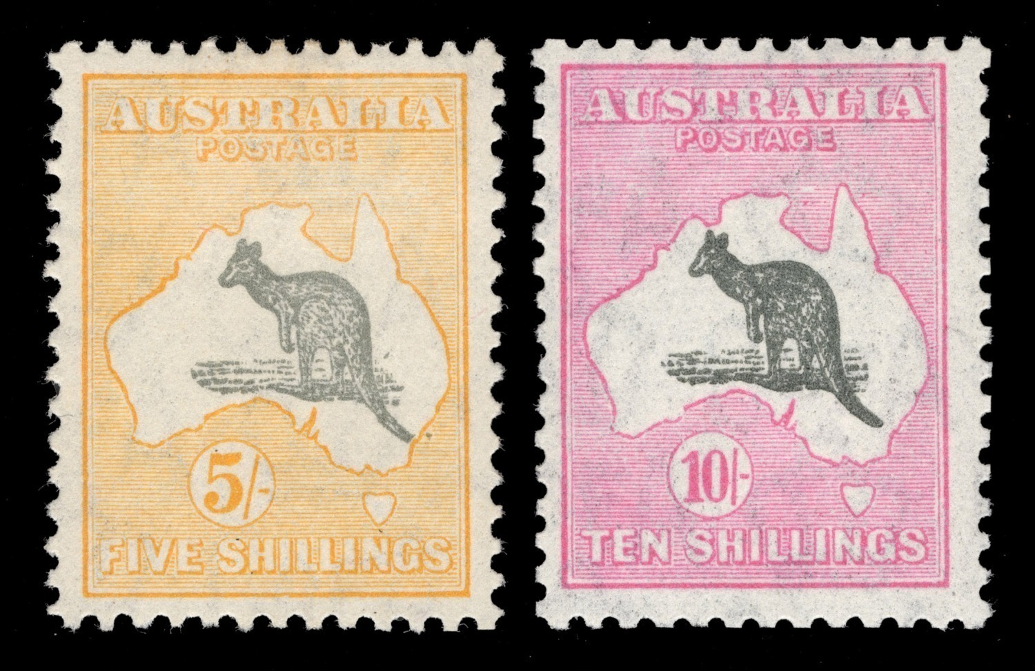5/- Grey & Orange-yellow, and 10/- Deep Grey & Pink, both fine and fresh, MLH. (2). (Image 1)