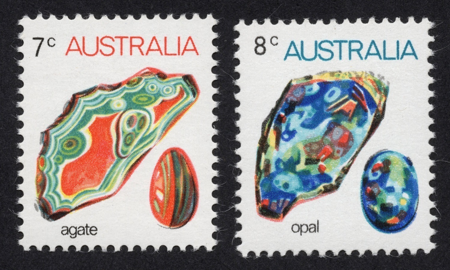 1973 (SG.550a and 551a) 7c Agate and 8c Opal, both with "Black omitted" (denominations & title); accompanied by the