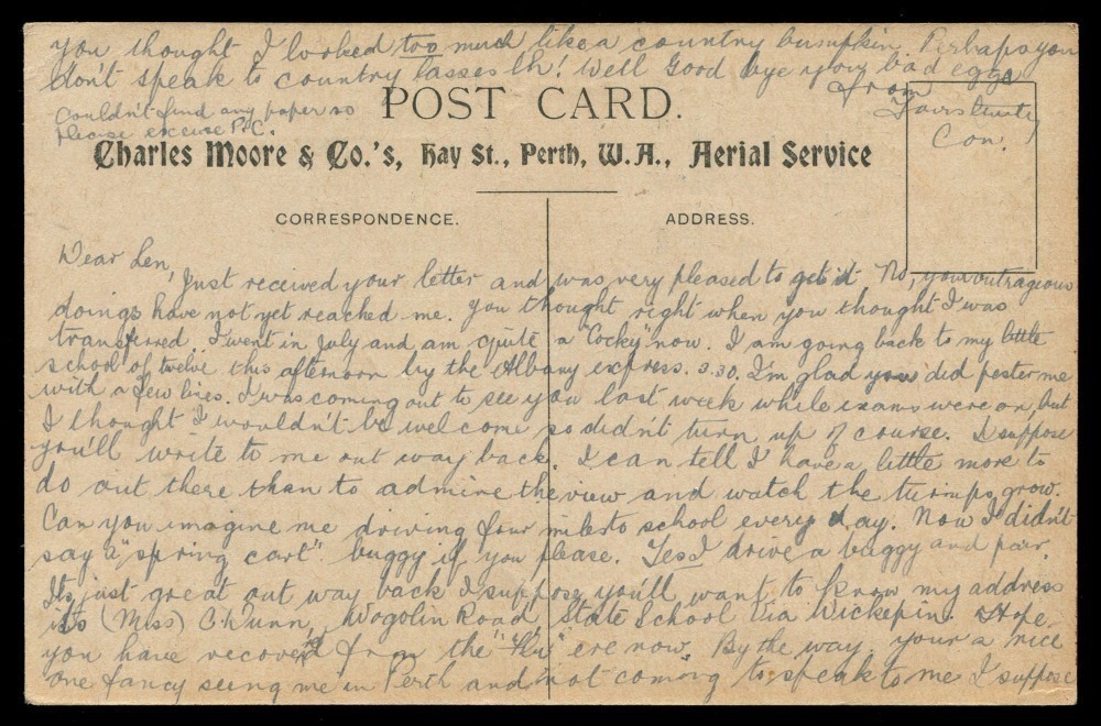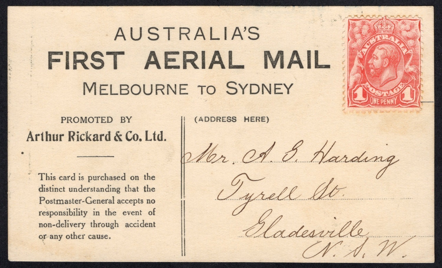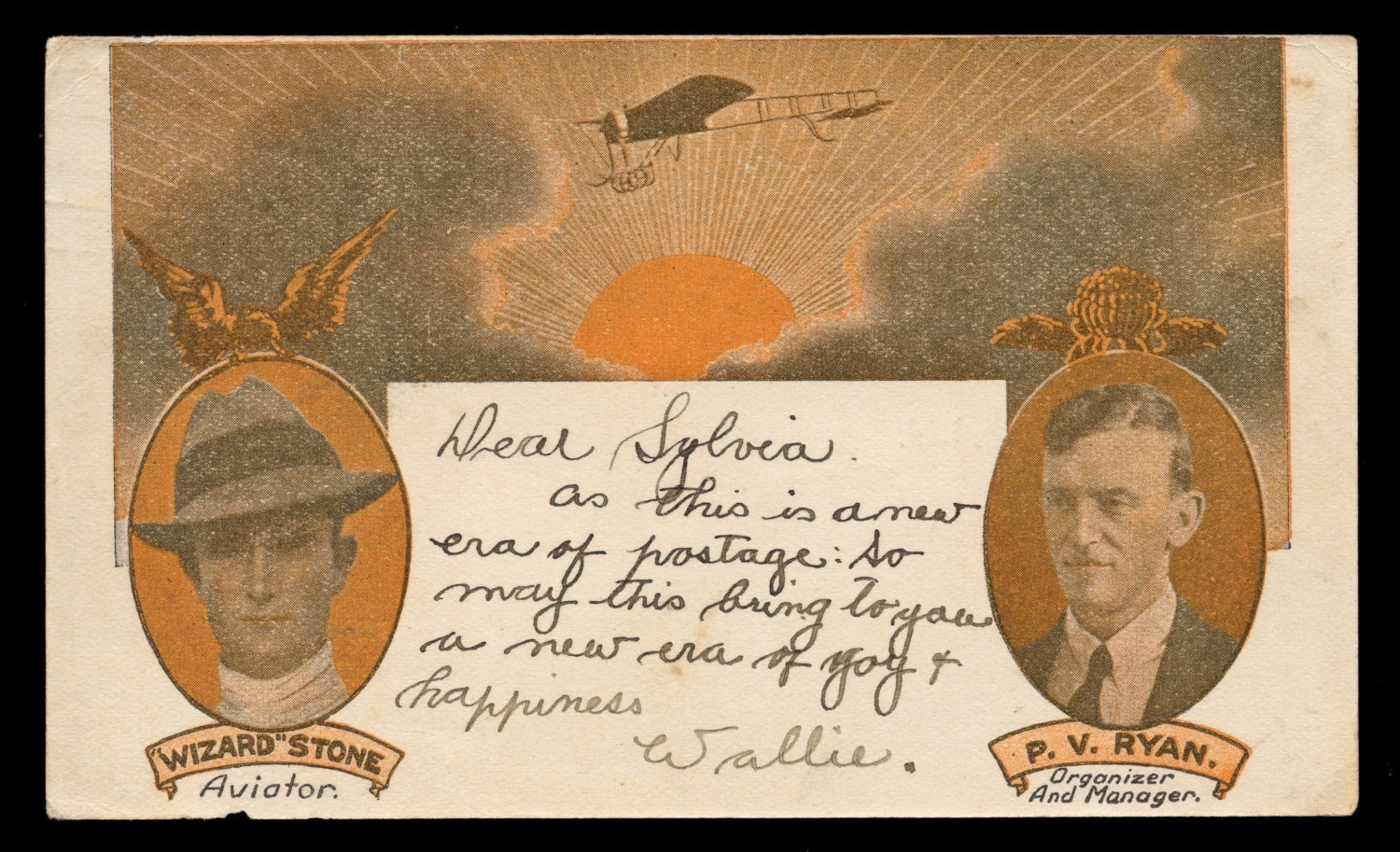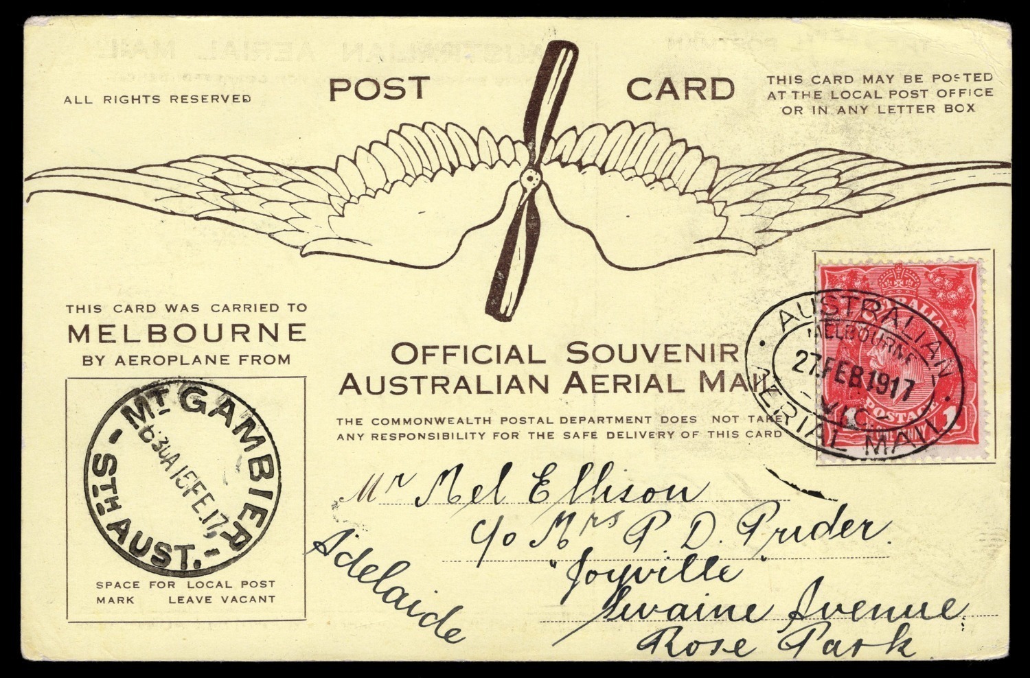 departure and arrival, and with a message that reads "Just a line to travel by the first aeroplane to land in Mt. Gambier."; a very fine example. (Image 1)