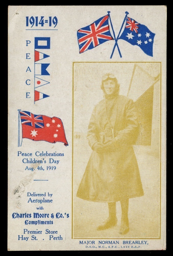 4 Aug.1919 (AAMC.19) Major Norman Brearley in an Avro biplane dropped a batch of advertising postcards for Charles Moore & Co