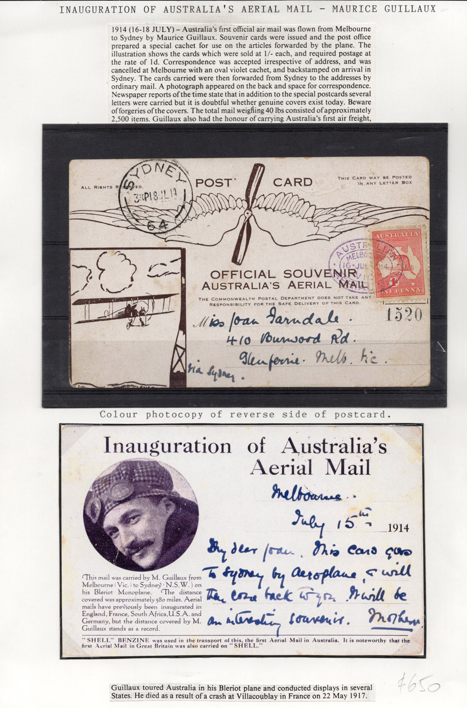 Australian official airmail with 1d Roo tied by 'AUSTRALIAN/MELBOURNE/16-JUL-1914/VIC/AERIAL MAIL' oval d/s and 'SYDNEY/18JL14/64' arrival cds at left. Cat $750. (Image 1)