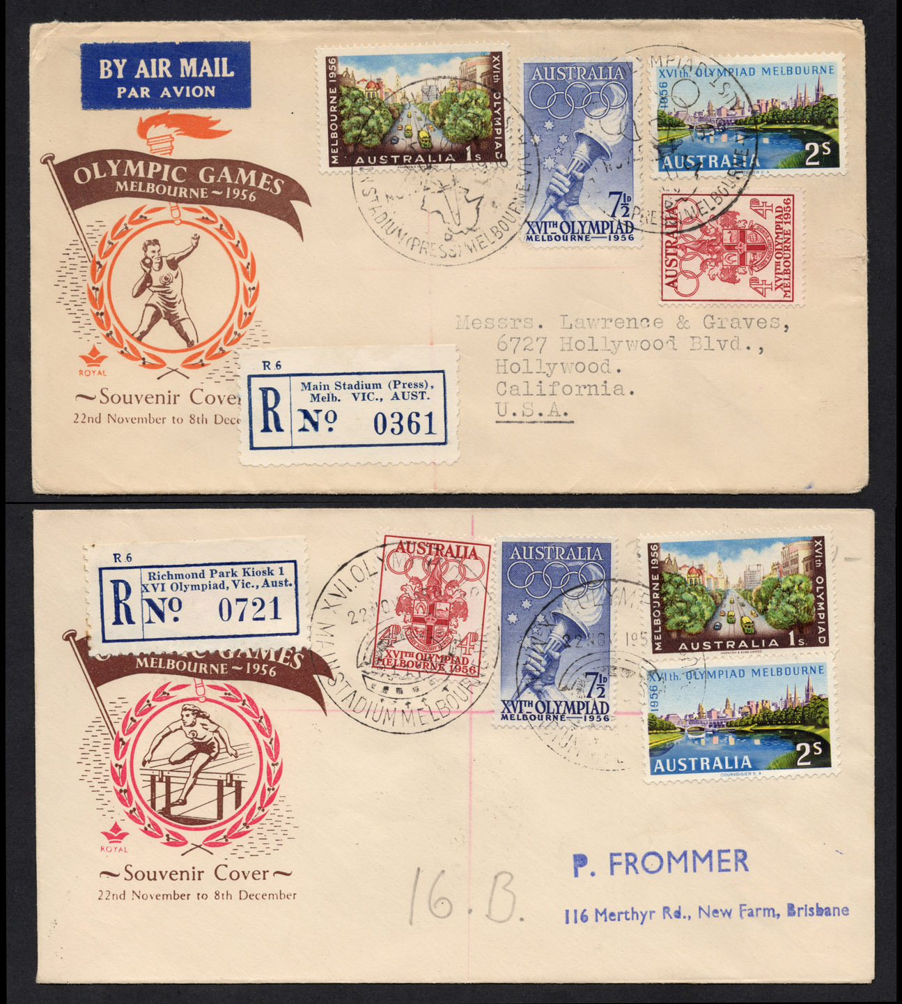The 1956 OLYMPICS TEMPORARY POST OFFICES: Two registered covers, each bearing the complete Olympics set of 4; one with "MAIN