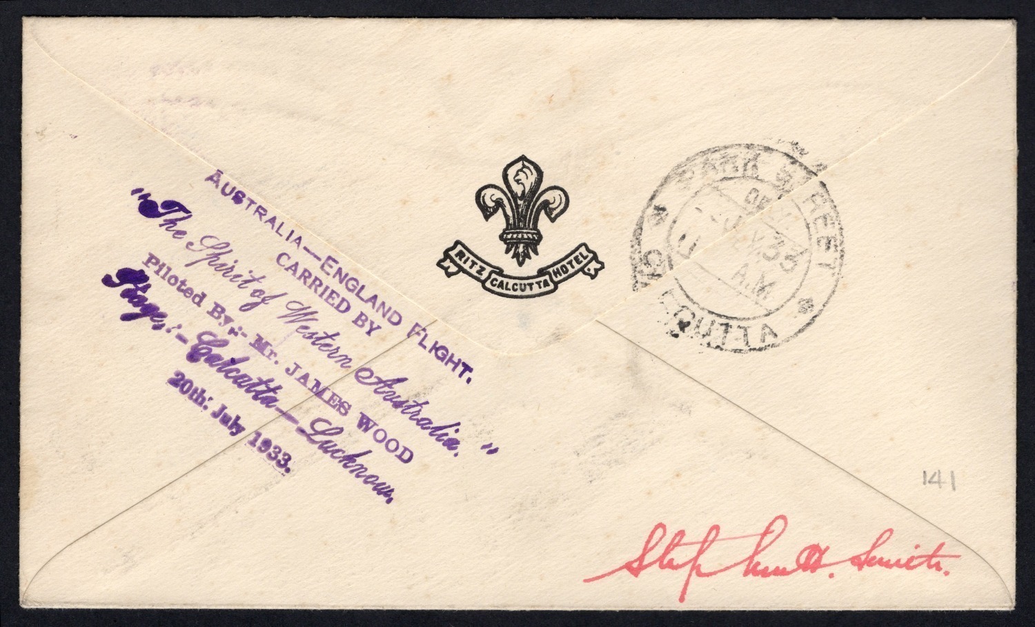 20 July 1933 (AAMC.317) Calcutta - Lucknow flown cover, carried by James Wood while en route from Australia to England in his