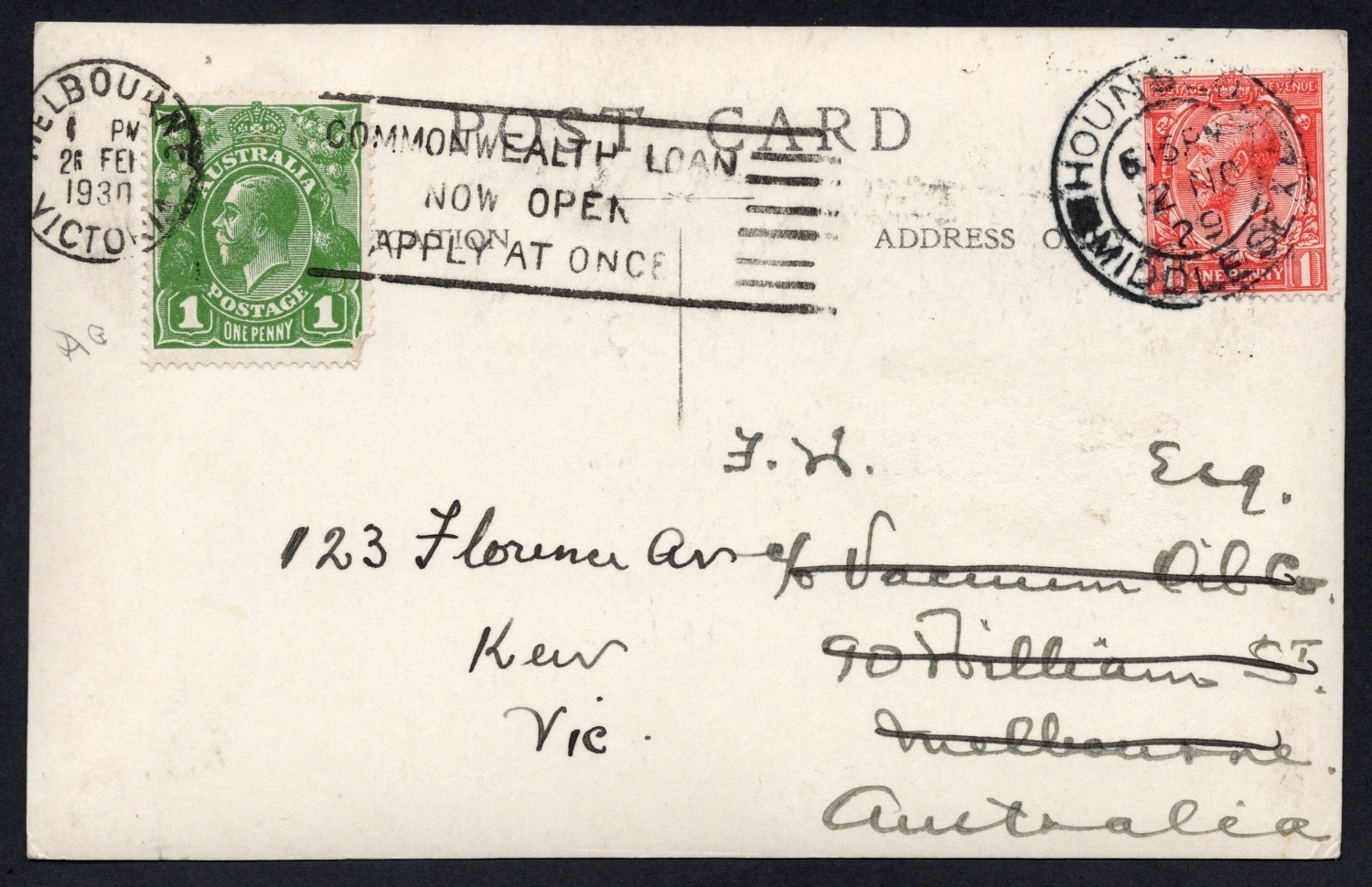 Keith Smith in 1919; postmarked at Hounslow and Melbourne, the postcard is also signed by the surviving brother, Keith Smith. Housed in a special folder created for the card, the text explains that "Ten cards were autographed on the front by the