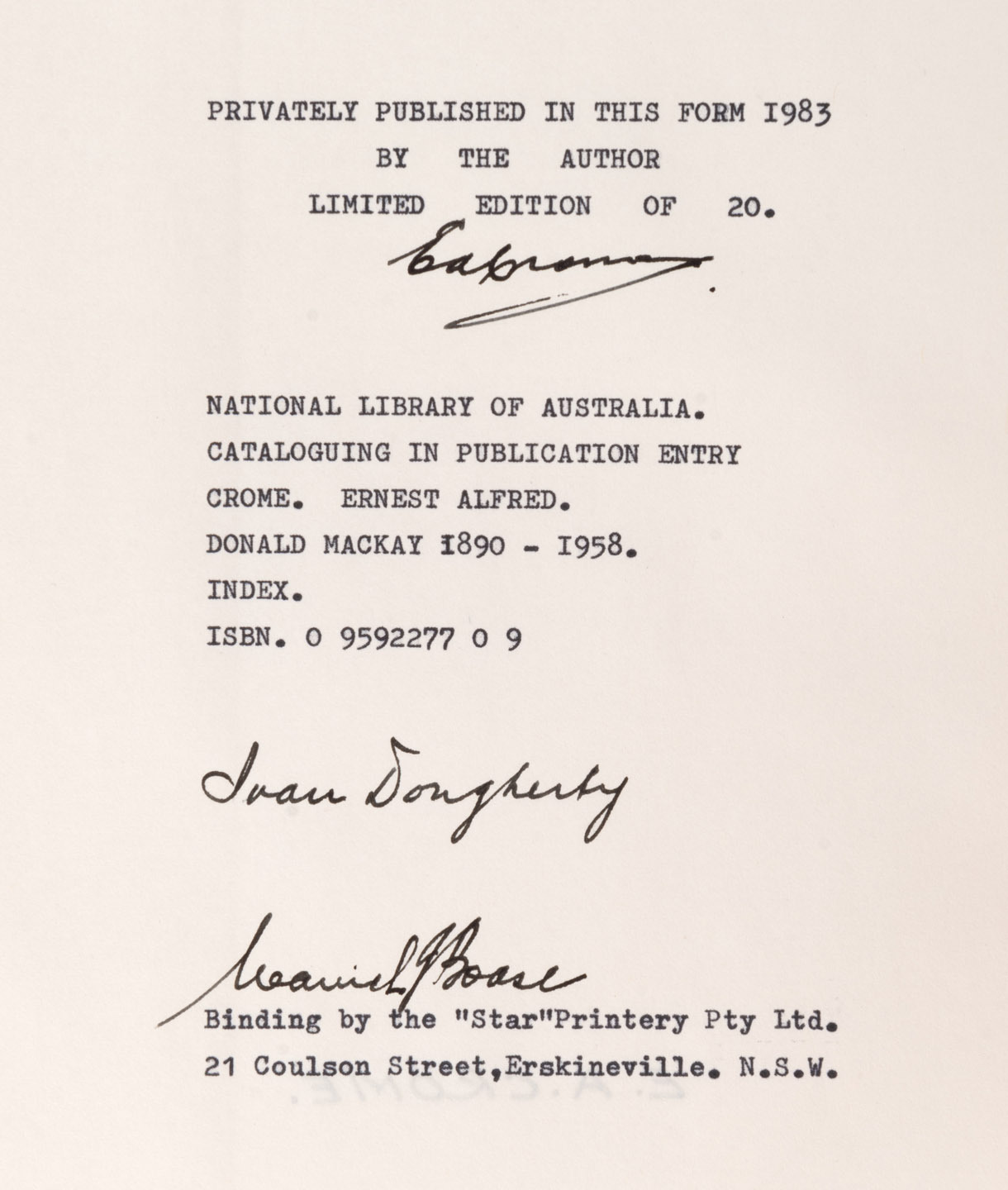 Two hardcover books, self published and bound by Ernie A. Crome: "Donald Mackay 1870-1958" (1983); "From Ships to