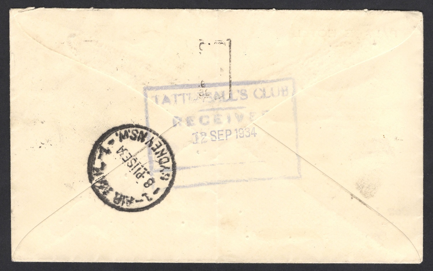 Taylor in the "Lady Southern Cross"; addressed to Alfred Levy at Tattersall's Club, Sydney; cancelled on arrival in Sydney and with Sydney & Tattersall's Club backstamps. (Image 1)