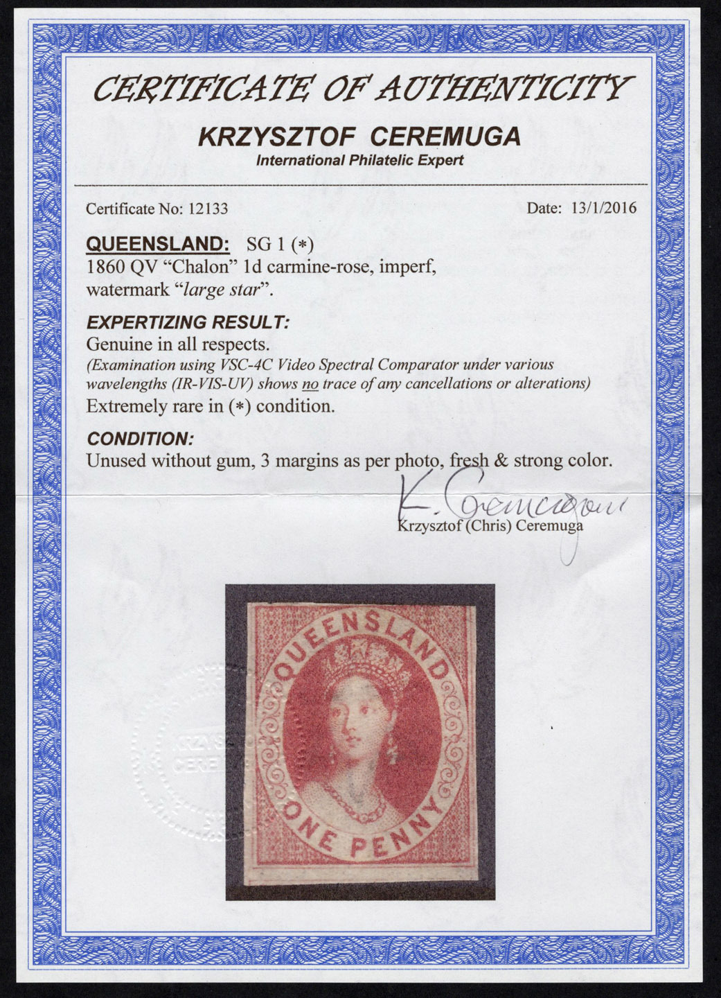 1860 (SG.1) 1d carmine-rose Queen Victoria Chalon portrait; Unused, with three good margins; touches at top right. Accompanied by