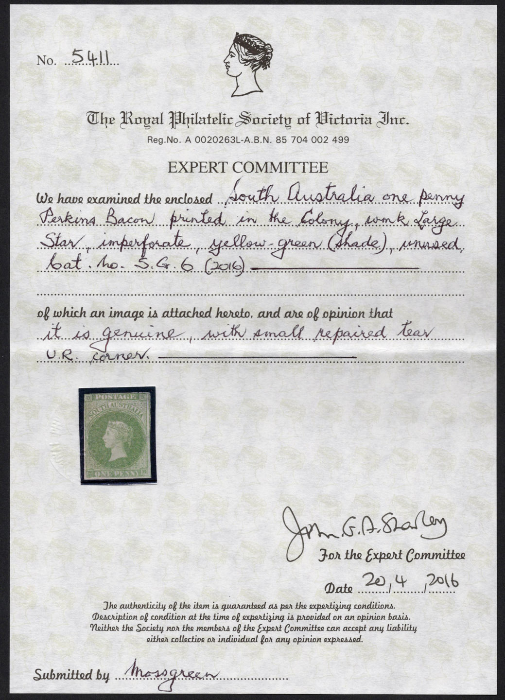 1856-58 Adelaide Printings 1d yellow-green (SG.6), margins just clear to large with a portion of the adjoining unit at right, the